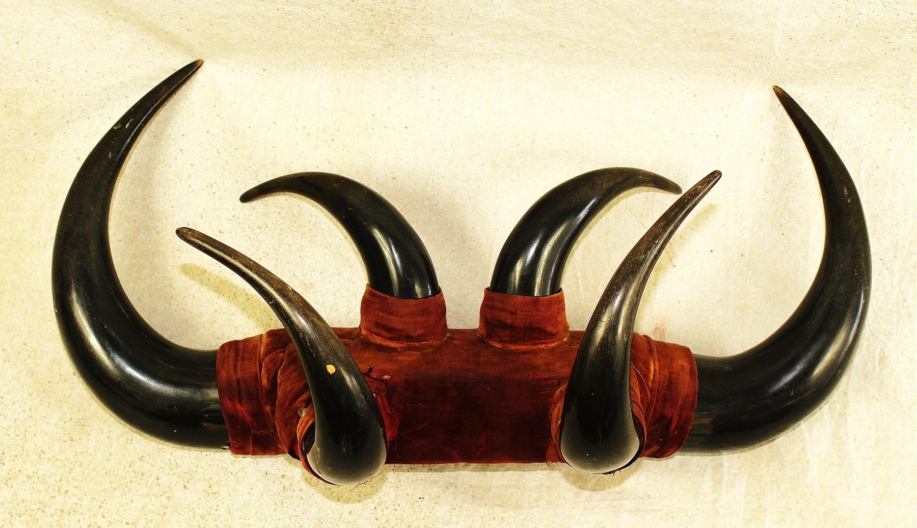 Nice six horn wall display made of buffalo horns and upholstered with early material.