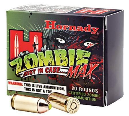 Manufacturer Information: Hornady Manufacturing introduces Zombie Max ammunition. Be prepared - supply yourself for the Zombie Apocalypse with Zombie Max ammunition, loaded with proven...yes, proven Z-Max bullets ...(have you seen a Zombie?). Put the dead to rest for good - visit a major sporting goods retailer near you to outfit yourself with Zombie Max ammunition. THIS IS not a toy. It is intended only to be used on zombies, also known as the living dead, un-dead, etc. No human being, plant, animal, vegetable or mineral should ever be shot with Zombie Max ammunition. Again, we repeat, Zombie Max ammunition is for use on zombies only - that's not a nickname, phrase or cute way of referring to anybody, place or thing. When we say zombies, we mean zombies. Product Specifications: Caliber:45 Automatic Colt Pistol (ACP) Bullet Type:Z-Max Bullet Weight:185 GR Muzzle Energy:333 ft lbs Muzzle Velocity:900 fps Rounds Per Box:20 Boxes Per Case:10 Application:Target/Range Practice Casing Material:Brass