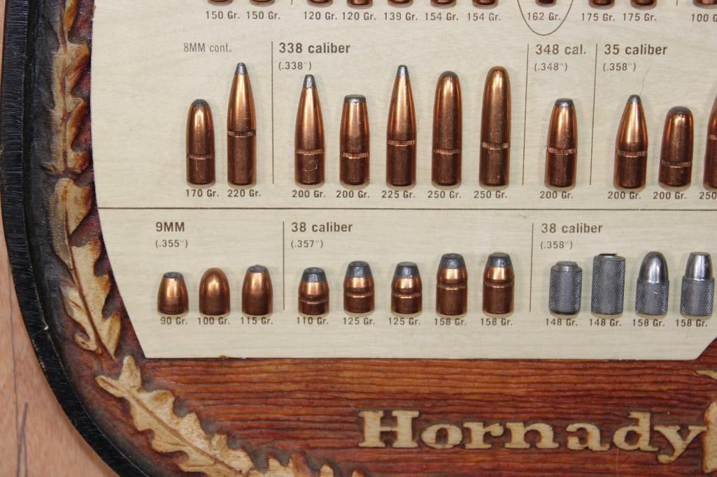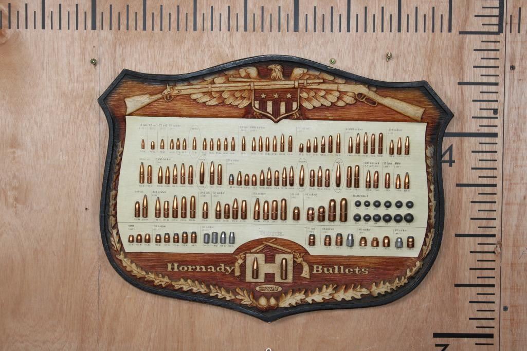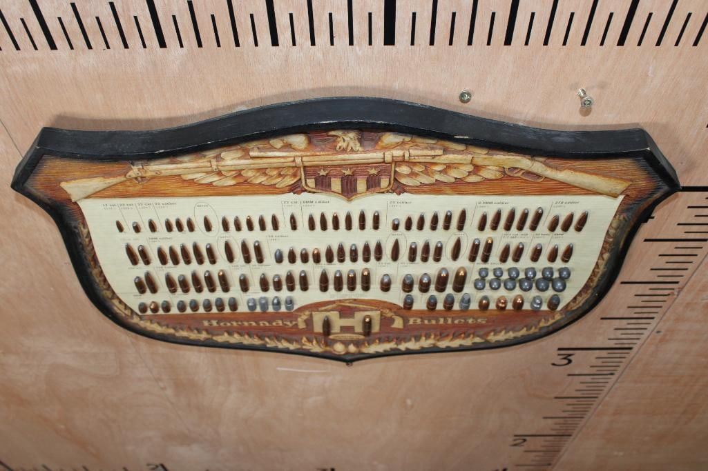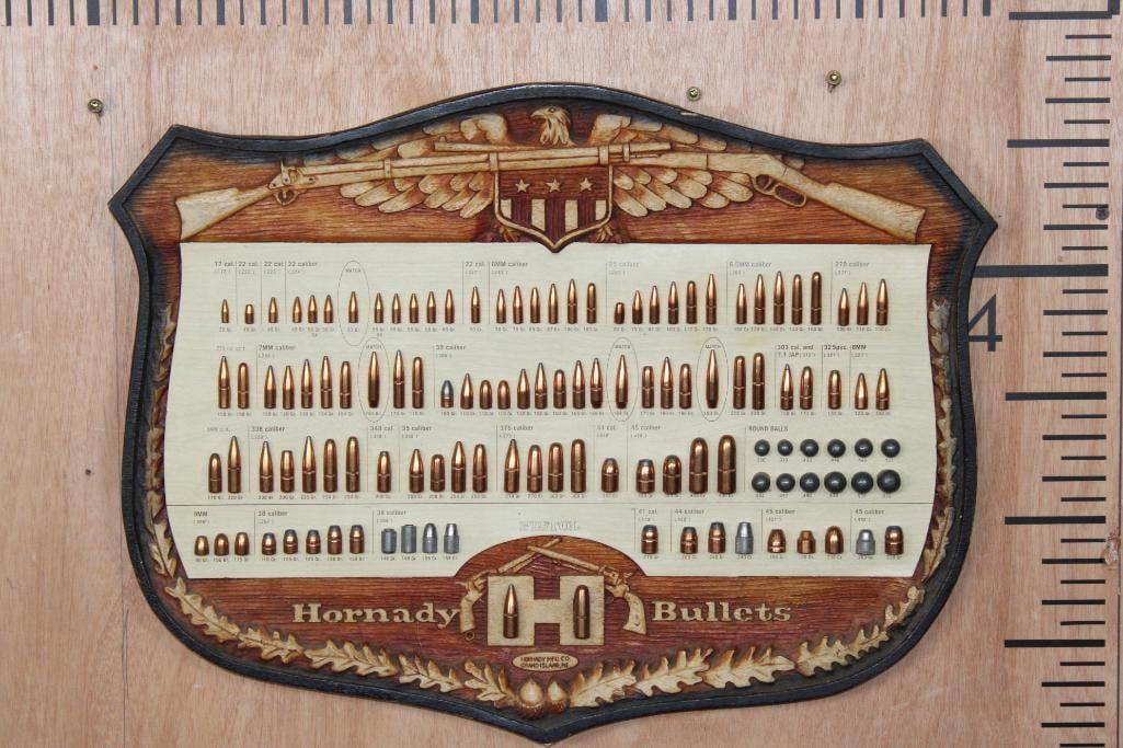 Very Nice Hornady Bullet Advertisement Display with Real Bullets. It measures 21" Wide x 16" Tall. The Total Weight is 8 lbs 7 oz. COLLECTIBLE AMMO AND HUNTING ADVERTISEMENTS