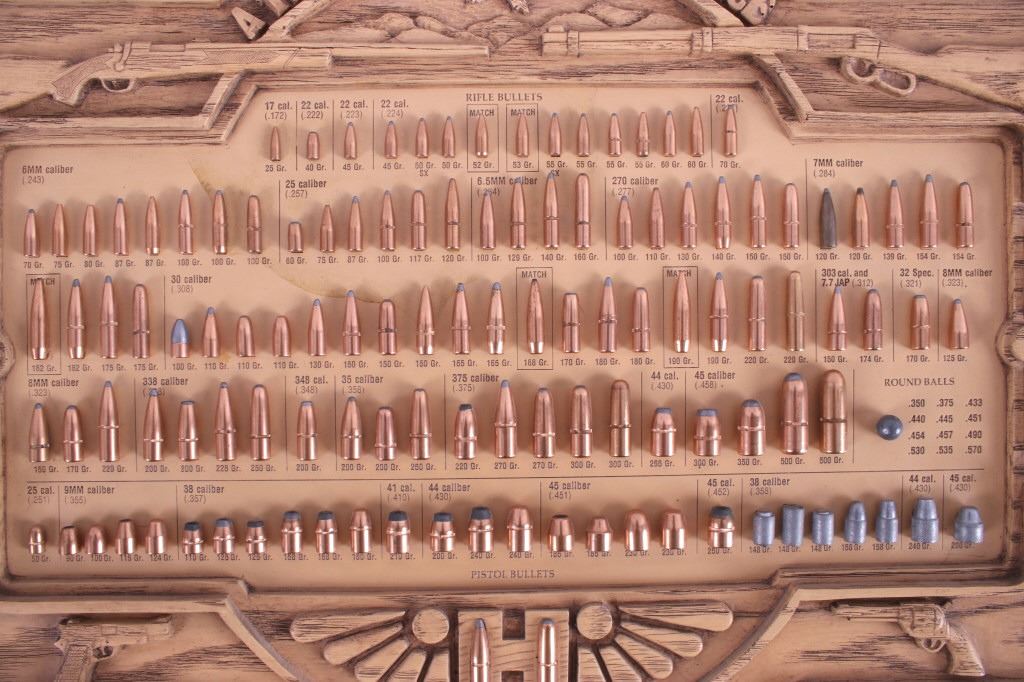 For auction in this lot is a vintage Hornady Bullet display. The pice showcases bullets ranging from .17 caliber all the way to .45 caliber. The bullets are mounted to a carved wooden plaque, reading "A Tradition of Excellent - Hornady Bullets". Additionally the display is finished with carvings of a Winchester Model 70, Winchester Model 1873, Colt 1911, and a Colt Peacemaker Single Action Army. The display shows very-good condition overall, and measures 23 1/4" wide, and 16 3/8" tall.