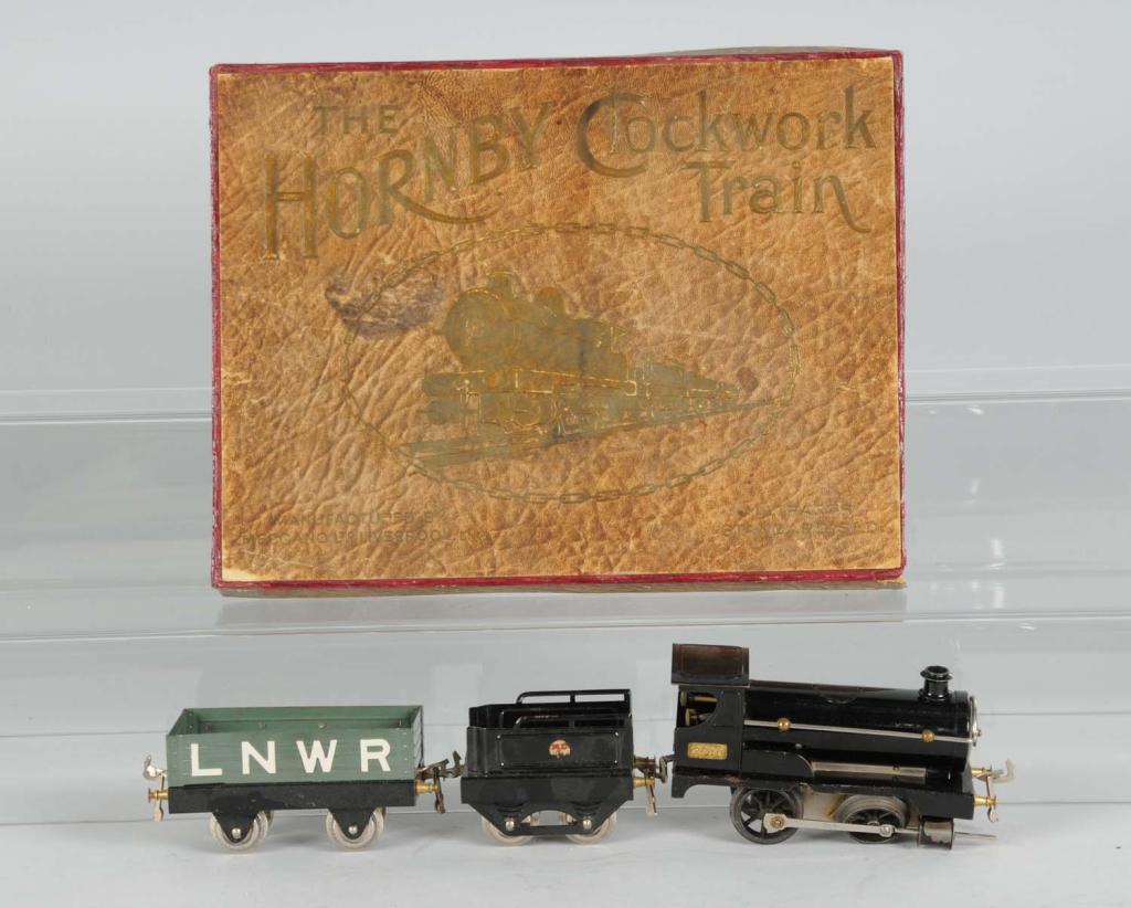 Pre-war. Includes early 2710 set box, two-rail track and beautiful set box. Three-piece set in excellent plus condition. Set box in excellent condition. Pre-war Train