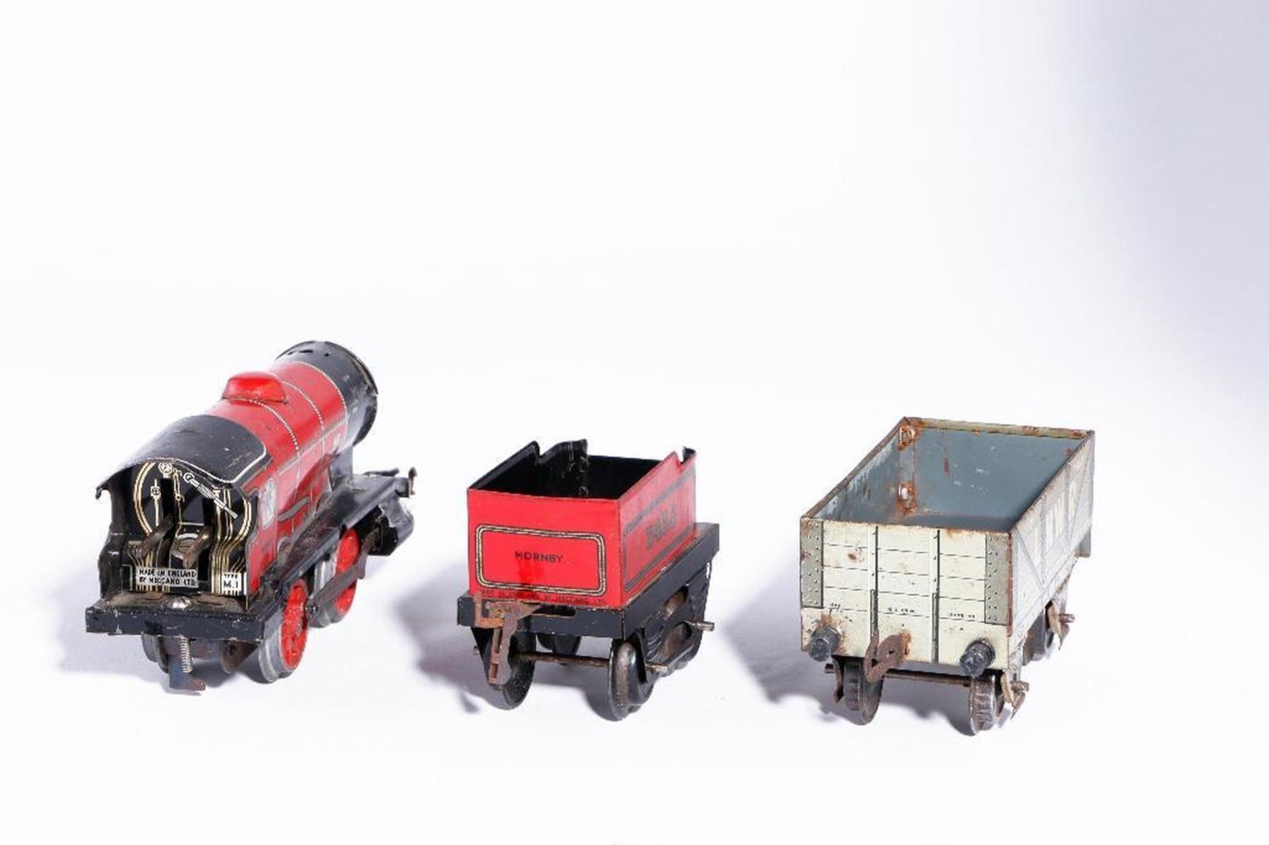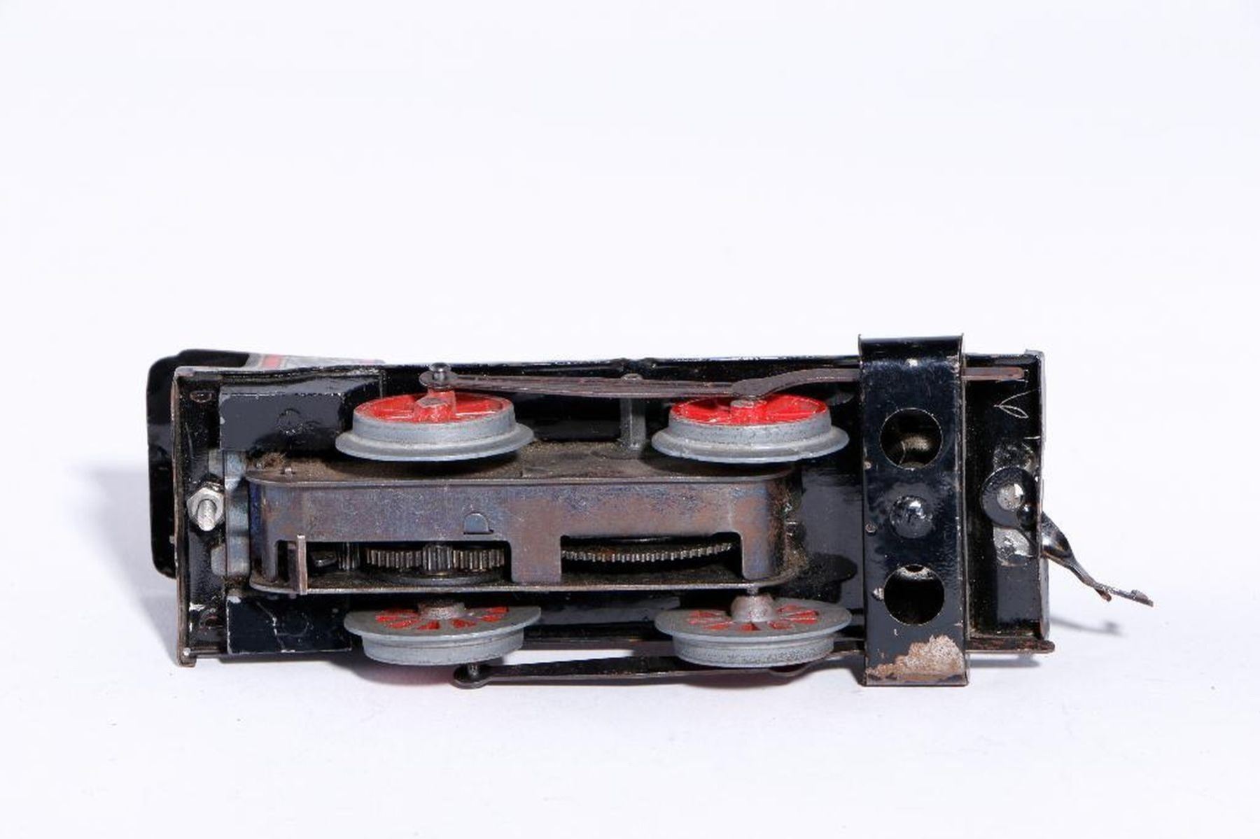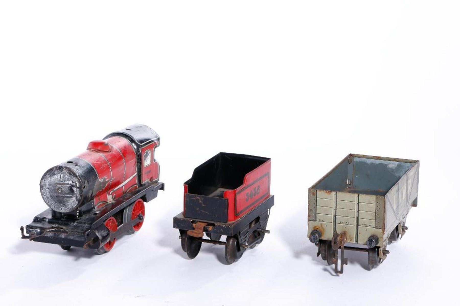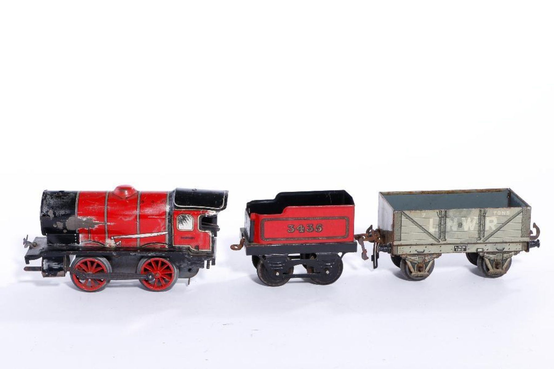 Lithographed steam locomotive and (4) wheeltender, red/black "3435" (finish damage onone side); (4) wheel goods wagon (gondola)lithographed in gray/black/white "LNWR", C-4/5