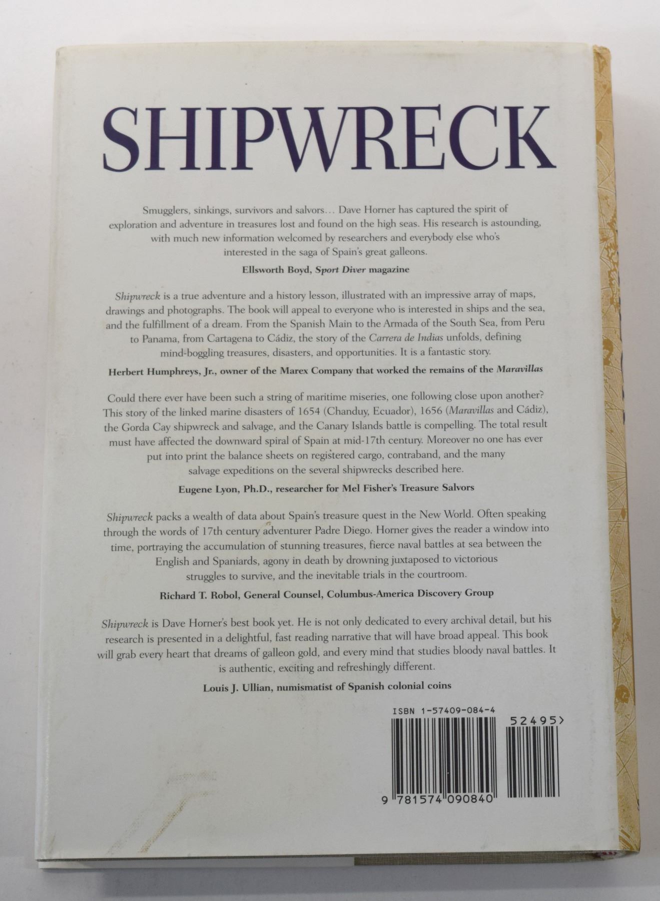 Horner, Dave. (Signed) SHIPWRECK: A SAGA OF SEA TRAGEDY AND SUNKEN TREASURE. Sheridan House Inc. 1999. 8vo, 295 pages; Hardcover w/ DJ; Inscribed by the author to Dan Thompson; Extensively researched story of the shipwreck and many subsequent salvage efforts of both "La Capitana" (which sank off Ecuador in 1654) and the "Maravillas" (which sank on Little Bahama Bank in 1656). The book includes both ancient and modern salvage efforts. Subject: History - Sunken Treasure