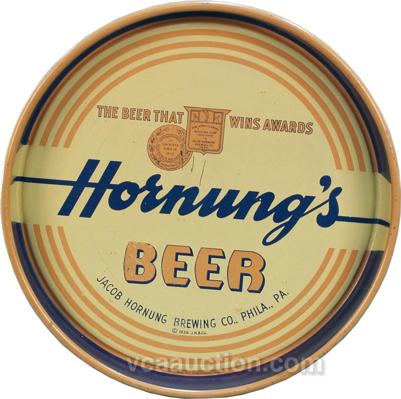 Hornung's Beer Round Tin Serving Tray c1938, "The Beer That Wins Awards" Jacob Hornung Brewing Co. Phila, PA. - 13" diam