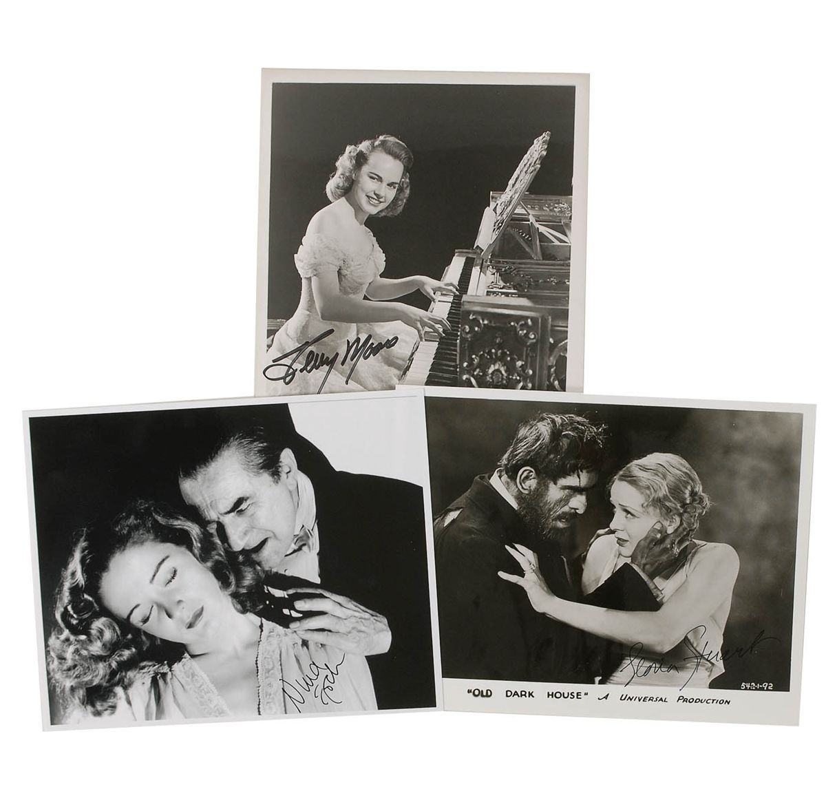 Three signed photos: one glossy 8 x 10 RKO promotional photo for Mighty Joe Young, signed in black felt tip by Terry Moore; one 10 x 8 promotional photo for Old Dark House, signed in black felt tip by Gloria Stuart; and one glossy 10 x 8 photo signed in black felt tip by Nina Foch. In overall fine condition.