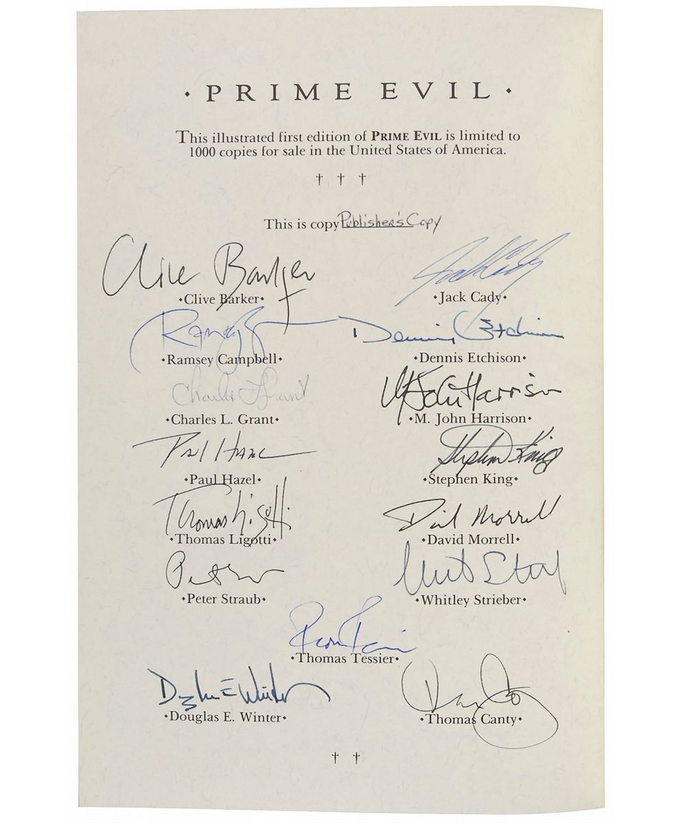 Signed book: Prime Evil. First illustrated edition, limited issue of 1000, publisher’s copy. West Kingston: Donald M. Grant. Hardcover with slipcase, 7 x 10, 352 pages. Signed on the colophon by all contributors to the anthology: Douglas Winter, Thomas Canty, Stephen King, Paul Hazel, Dennis Etchison, Clive Barker, Thomas Tessier, M. John Harrison, David Morrell, Peter Straub, Charles L. Grant, Thomas Ligotti, Ramsey Campbell, Whitley Strieber, and Jack Cady. In fine condition. From the collection of noted publisher and founder of Lord John Press, Herb Yellin.