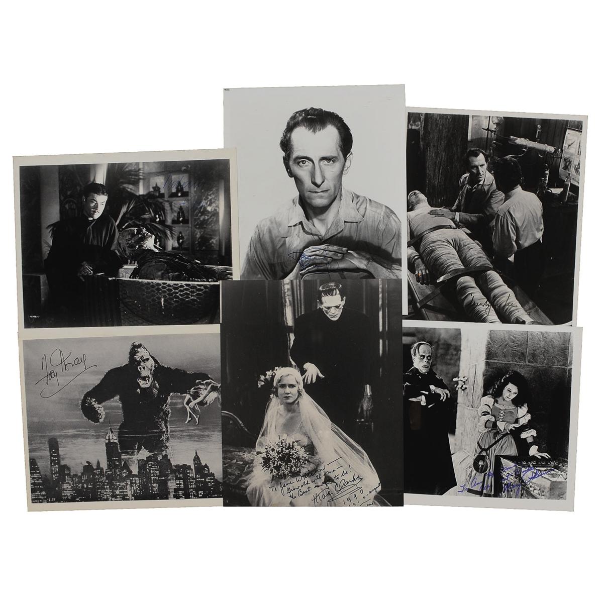 Six 8 x 10 or 10 x 8 photos, five glossy and one cardstock, each signed in felt tip by the respective celebrity shown. Signers are: Turhan Bey, Mae Clark (ins), Peter Cushing, Christopher Lee, Mary Philbin (ins), and Fay Wray. In overall fine condition.