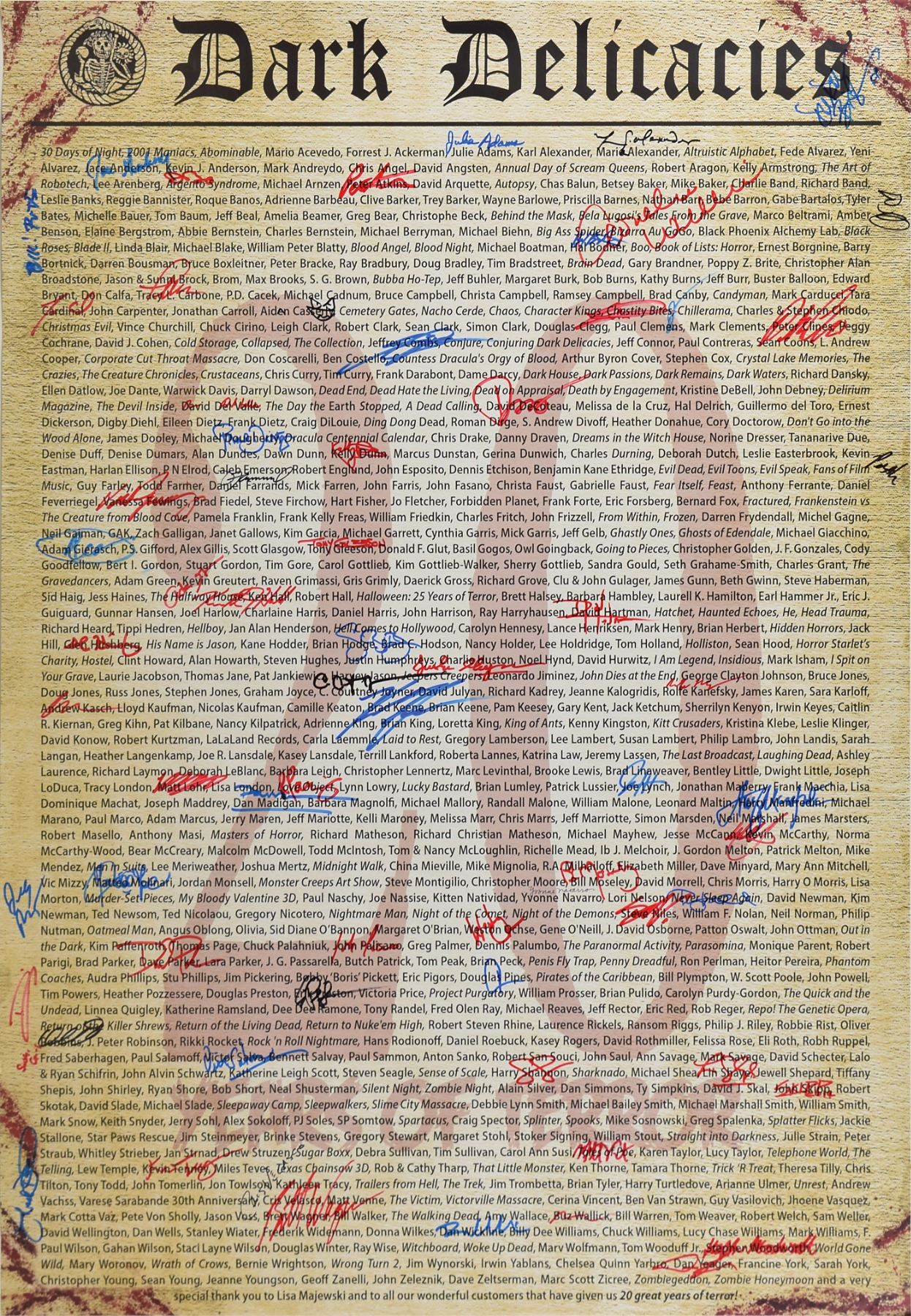 Color 27 x 39 poster for the 20th anniversary of the Dark Delicacies horror shop in Burbank, California, showing a massive list of names and titles from the horror canon, signed in various colored felt tip by over 60 actors, authors, and filmmakers, including: Julie Adams, Peter Atkins, Kelly Dunn, Tony Gleeson, Ken Hall, Steve Niles, Victor Salva, Bill Moseley, Dan Yeager, and many more. Rolled and in fine condition.
