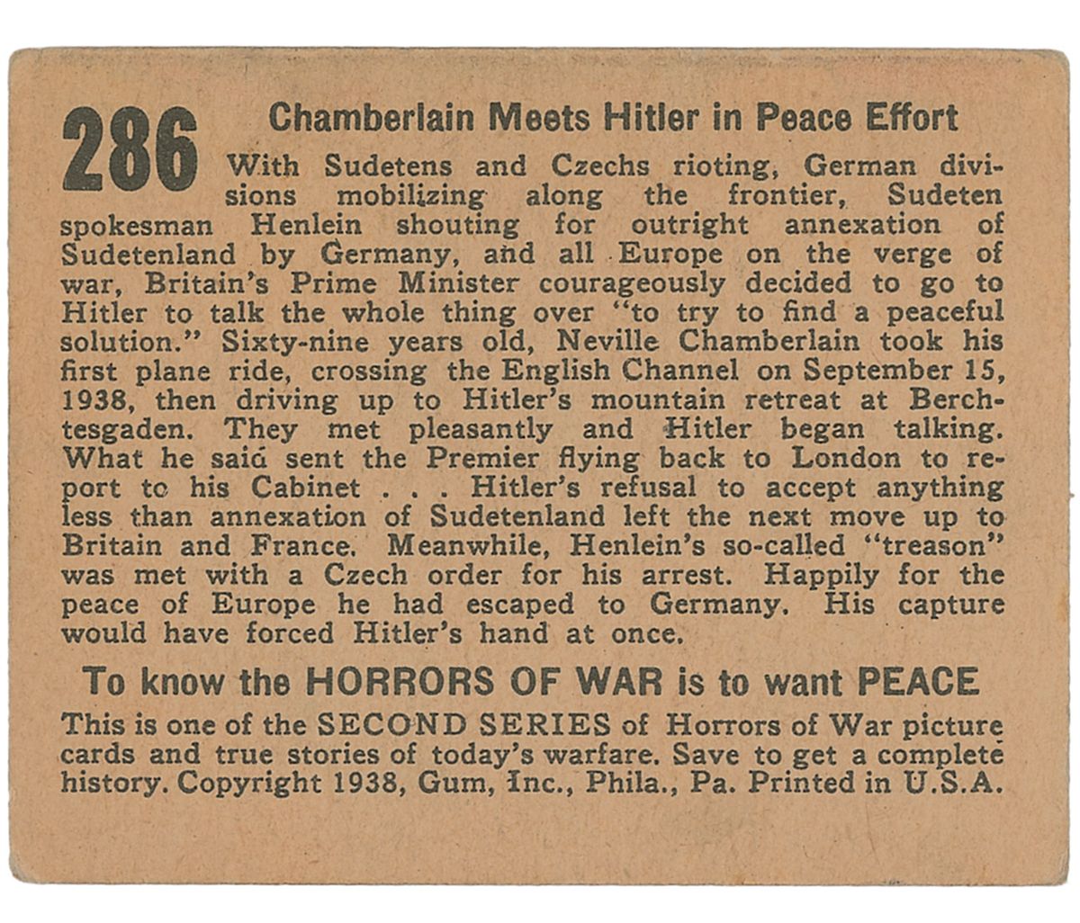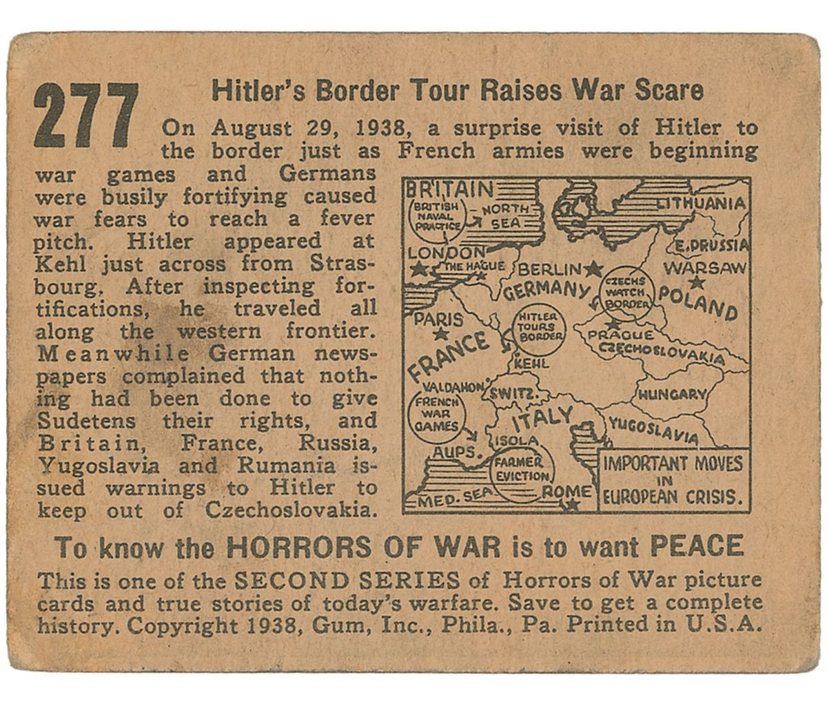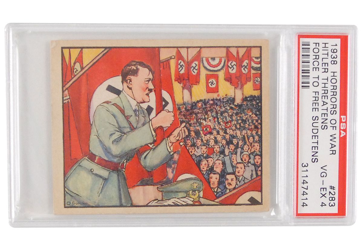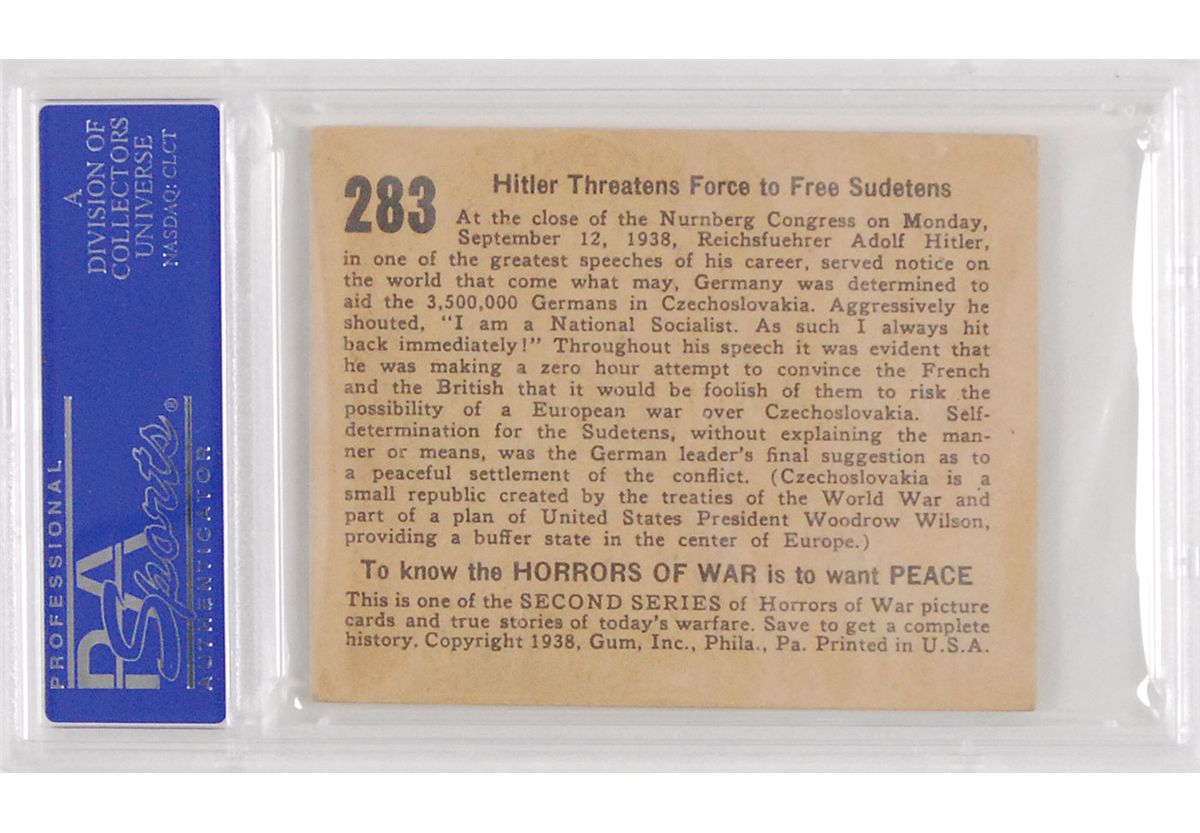 Scarce mid-grade complete set of the 1938 R69 Gum, Inc., ‘Horrors of War’ trading cards, comprised of all 288 cards. In overall very good condition; none of the cards are creased. Card #283, depicting Adolf Hitler, is encapsulated by PSA and graded “VG-EX 4.” The ‘Horrors of War’ series is one of the most famous non-sport trading card sets ever issued, owing to its impressive and violent illustrations, which depict and describe events of the Sino-Japanese War, Ethiopian War, and Spanish Civil War. It was originally released as a 240-card set, with 48 cards later added to depict the violence in Germany and start of World War II; given their shorter print run, these last 48 cards are especially scarce.