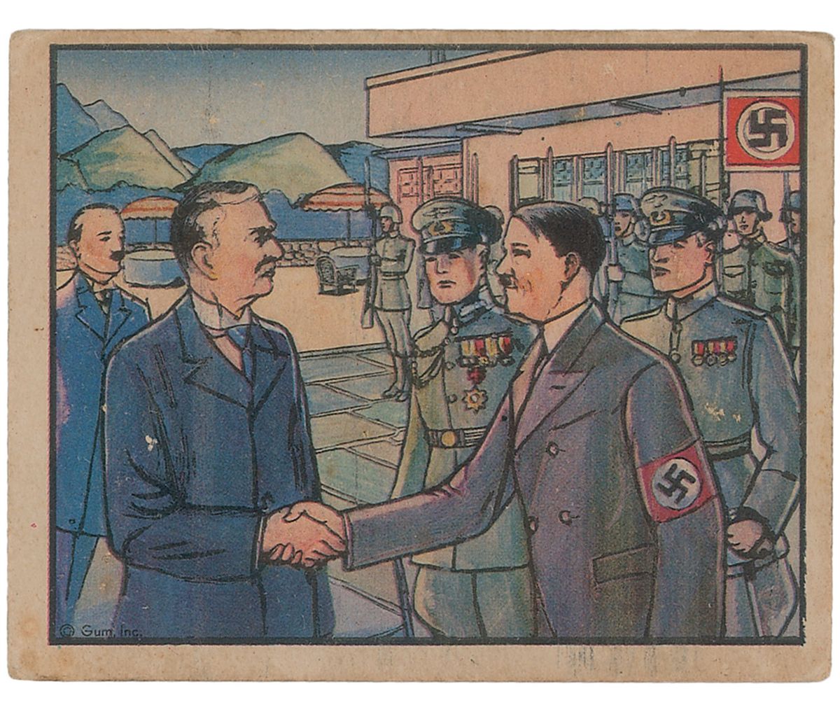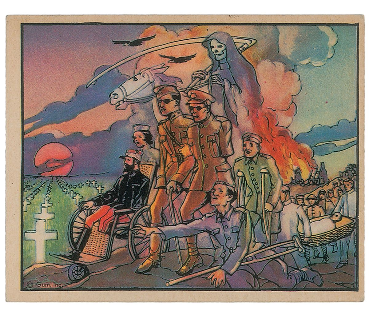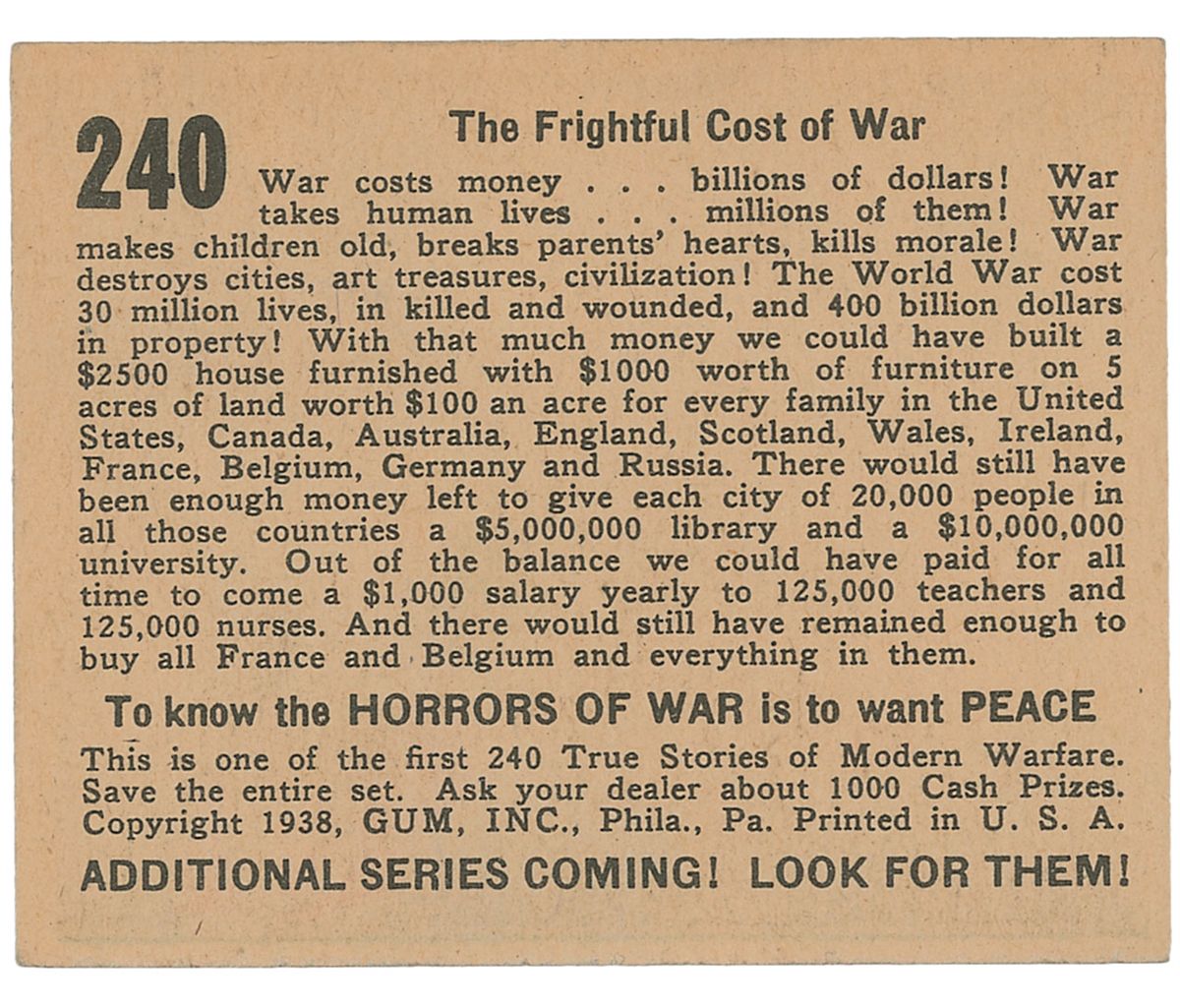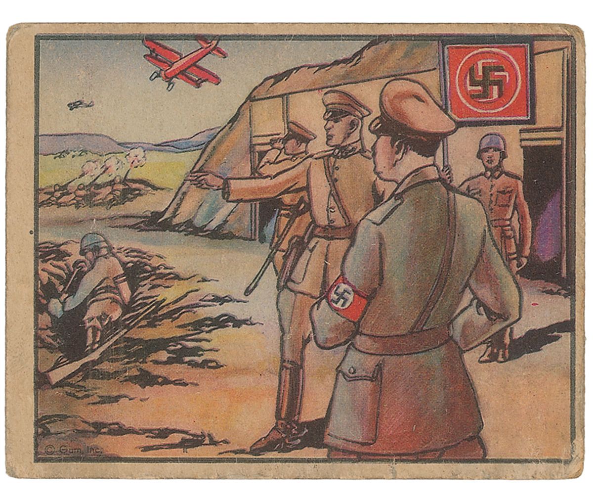 Scarce mid-grade complete set of the 1938 R69 Gum, Inc., ‘Horrors of War’ trading cards, comprised of all 288 cards. In overall very good condition; none of the cards are creased. Card #283, depicting Adolf Hitler, is encapsulated by PSA and graded “VG-EX 4.” The ‘Horrors of War’ series is one of the most famous non-sport trading card sets ever issued, owing to its impressive and violent illustrations, which depict and describe events of the Sino-Japanese War, Ethiopian War, and Spanish Civil War. It was originally released as a 240-card set, with 48 cards later added to depict the violence in Germany and start of World War II; given their shorter print run, these last 48 cards are especially scarce.