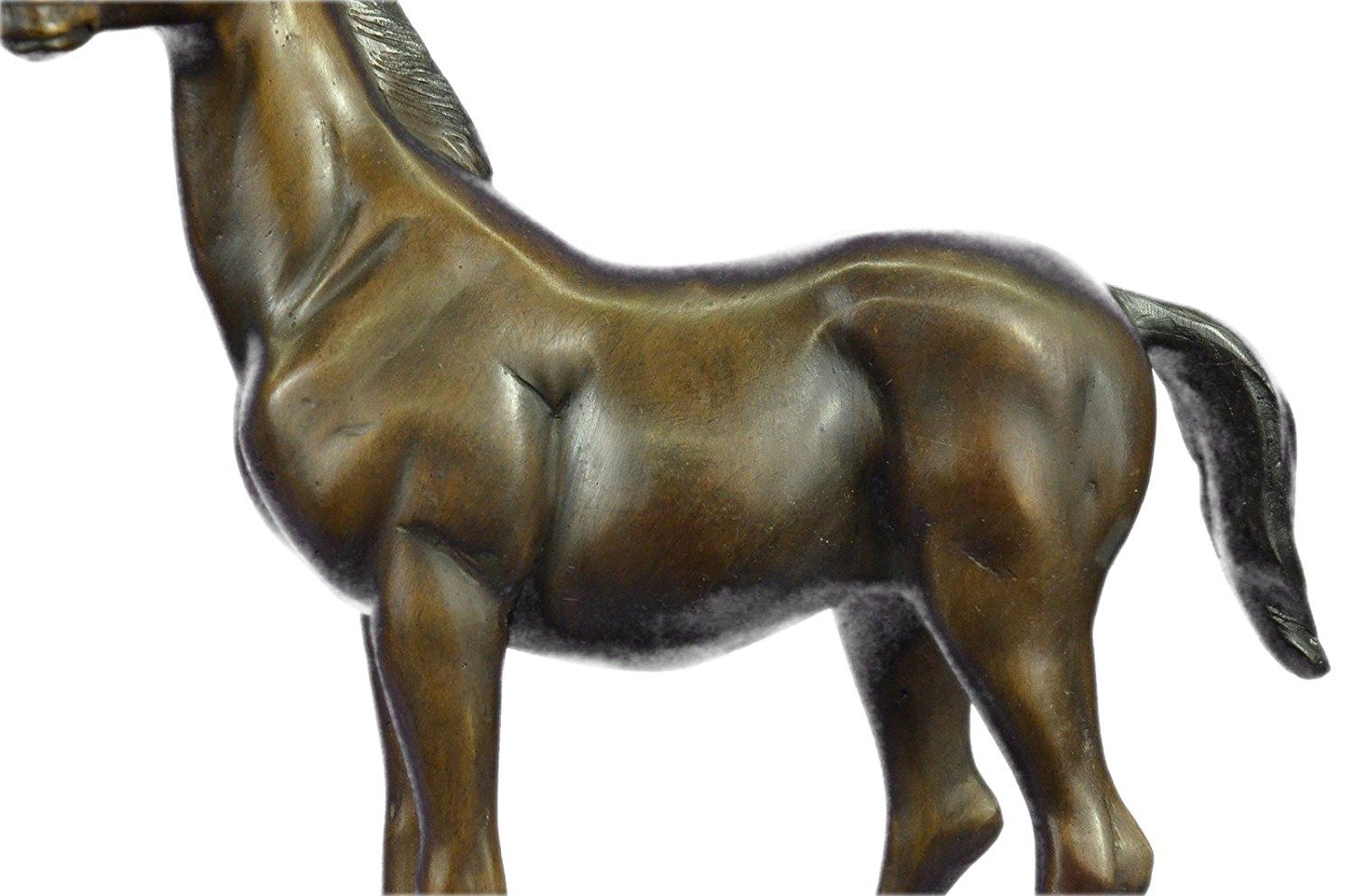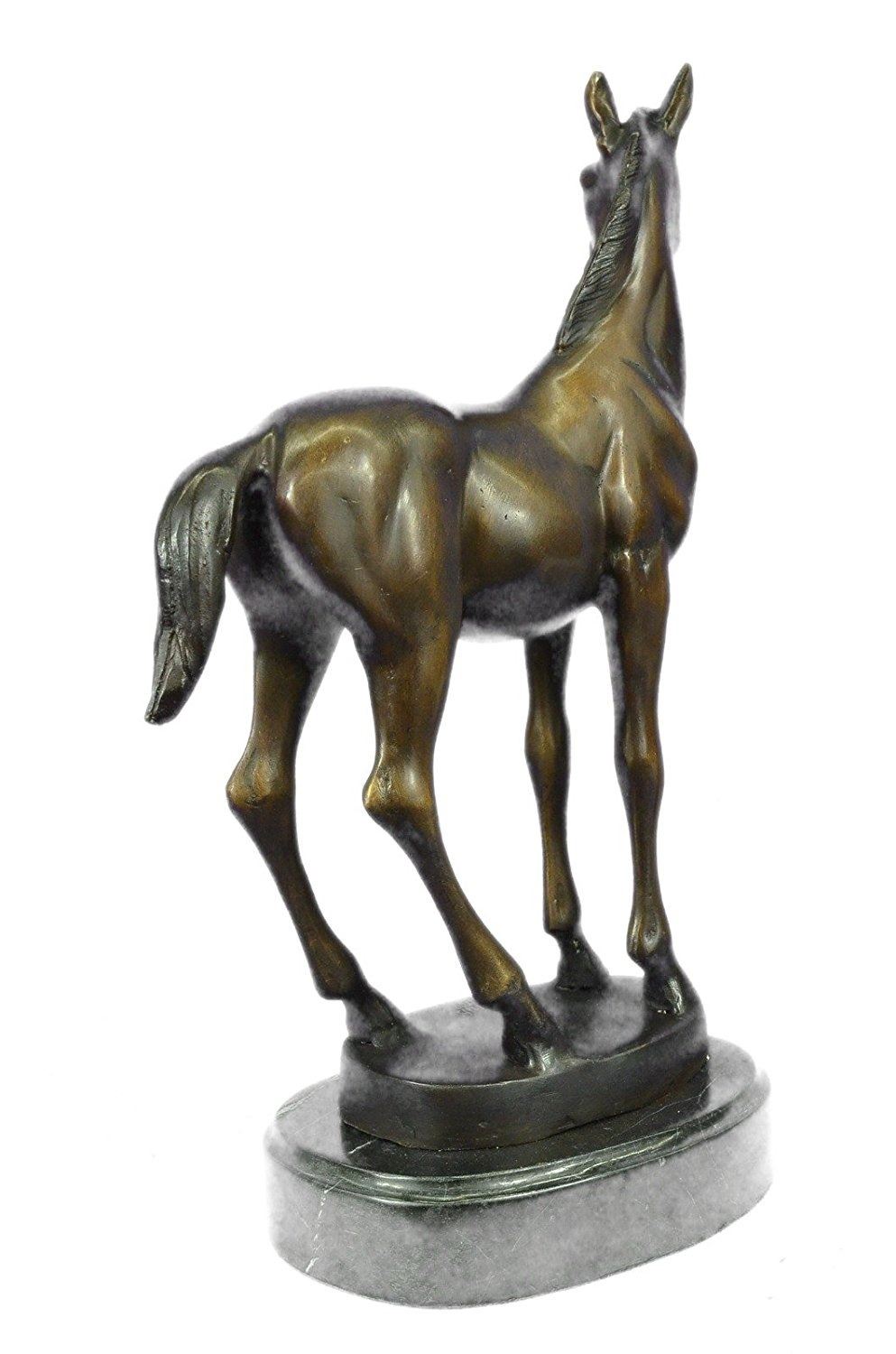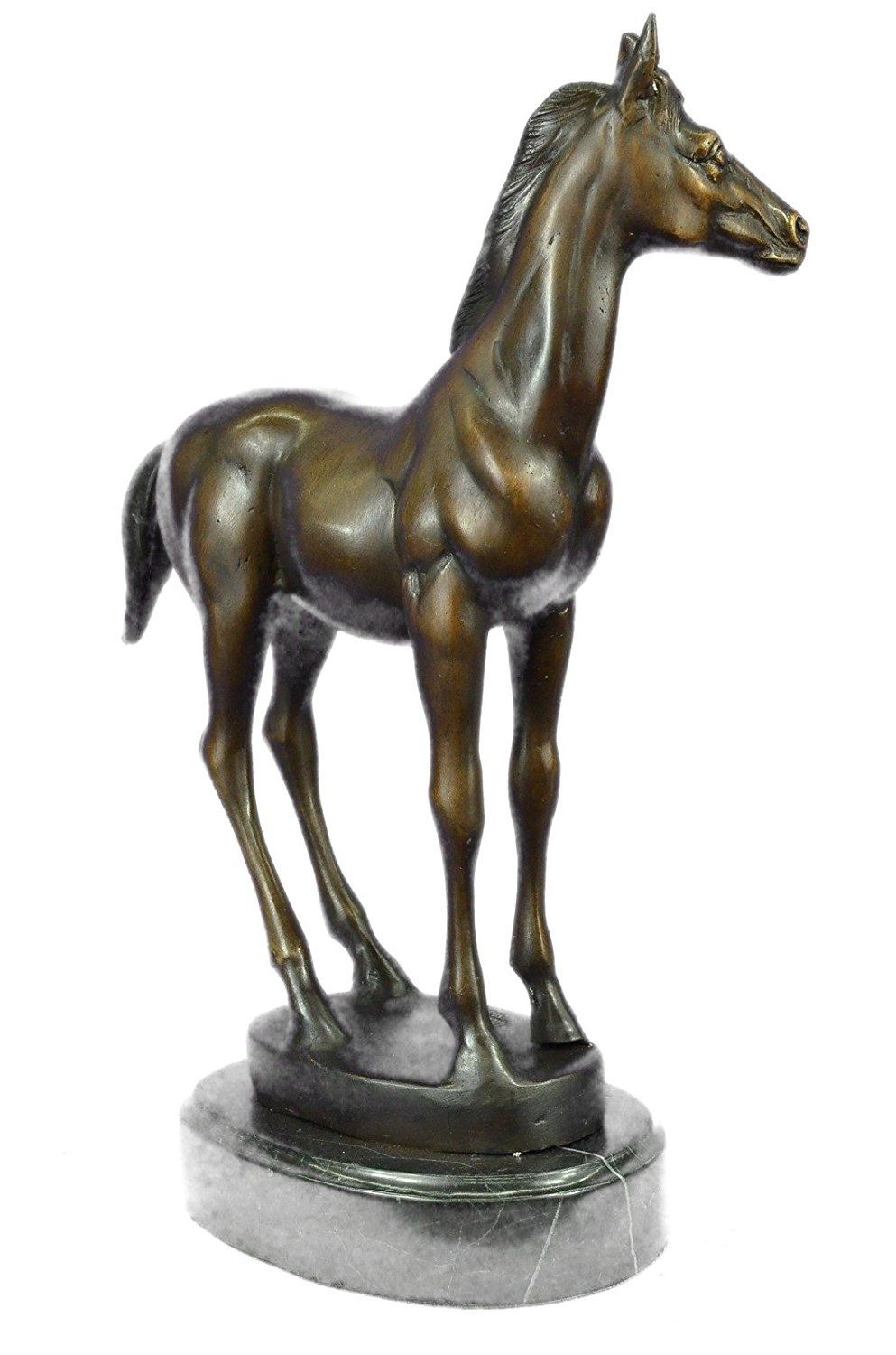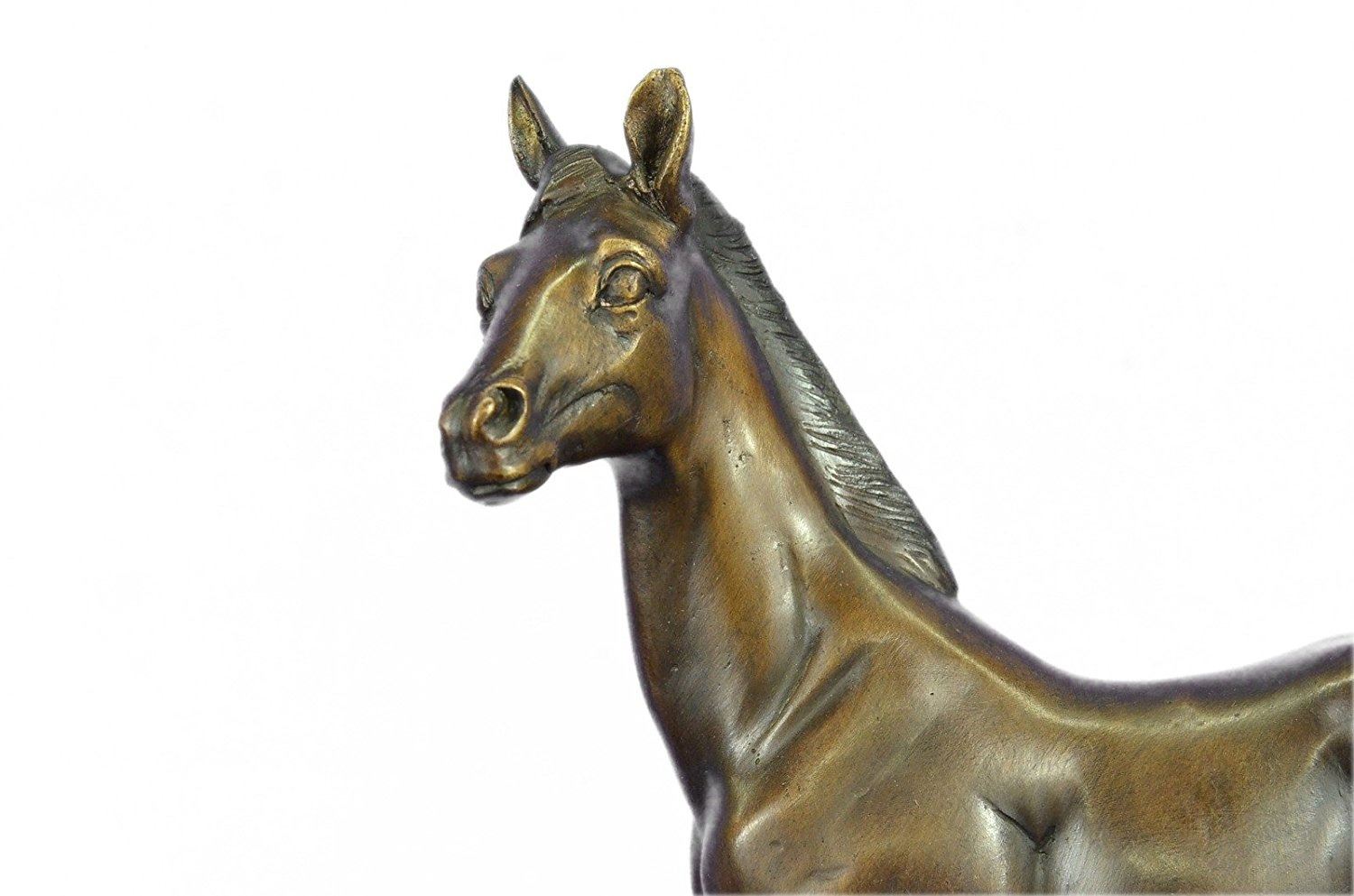 He watches attentively at something to his left and stands square. Its eyes are large and his face and body are intricately detailed in a perfect depiction of this amazing animal, down to the muscle structure, nostrils and ears. But the most striking mimic of a cult is this sculptures amazing patina. The mane and tail are both a brilliant gold, the body is a two tone brown, darker in the crevasses, and the legs from the knee to ankle a lustrous silver. He is a beautifully accurate sculpture that would be appreciated by any horse lover for many years to come. Made of 100% solid bronze and sitting on a solid marble base, it is handmade using the ancient Lost Wax Method. Bronze Dimensions with Marble Base: Height 16 X Width 12 inches. Weight: 12 LBS. Inventory: 5757646M4475