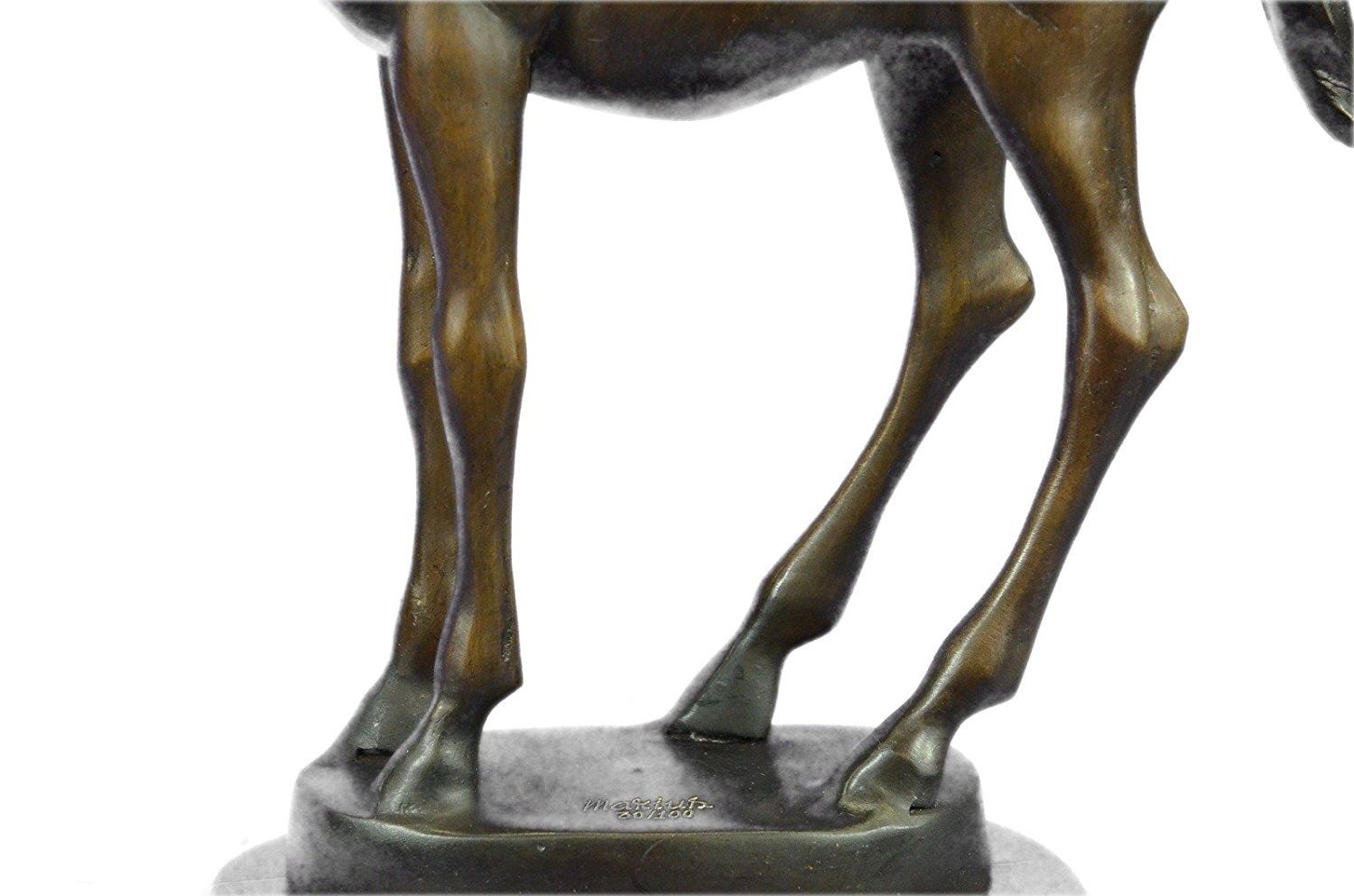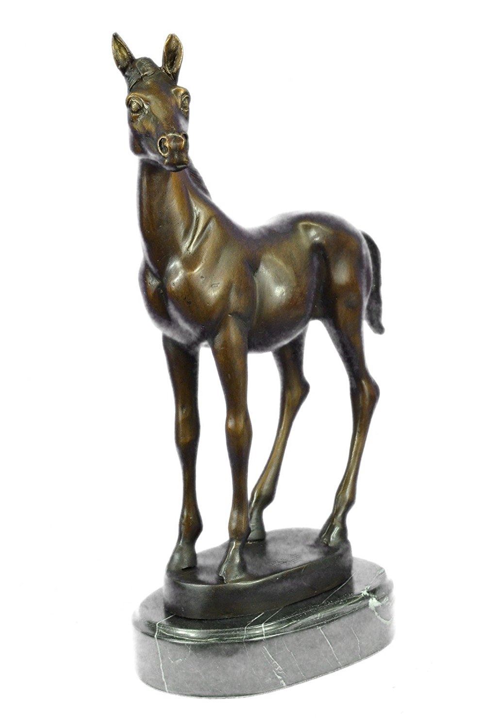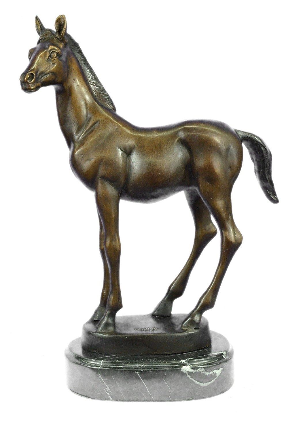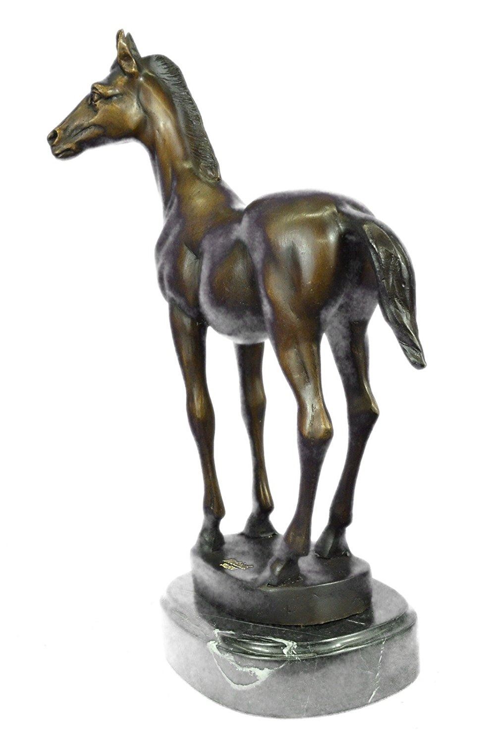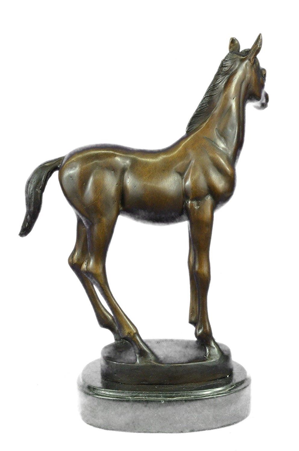He watches attentively at something to his left and stands square. Its eyes are large and his face and body are intricately detailed in a perfect depiction of this amazing animal, down to the muscle structure, nostrils and ears. But the most striking mimic of a cult is this sculptures amazing patina. The mane and tail are both a brilliant gold, the body is a two tone brown, darker in the crevasses, and the legs from the knee to ankle a lustrous silver. He is a beautifully accurate sculpture that would be appreciated by any horse lover for many years to come. Made of 100% solid bronze and sitting on a solid marble base, it is handmade using the ancient Lost Wax Method. Bronze Dimensions with Marble Base: Height 16 X Width 12 inches. Weight: 12 LBS. Inventory: 5757646M4475