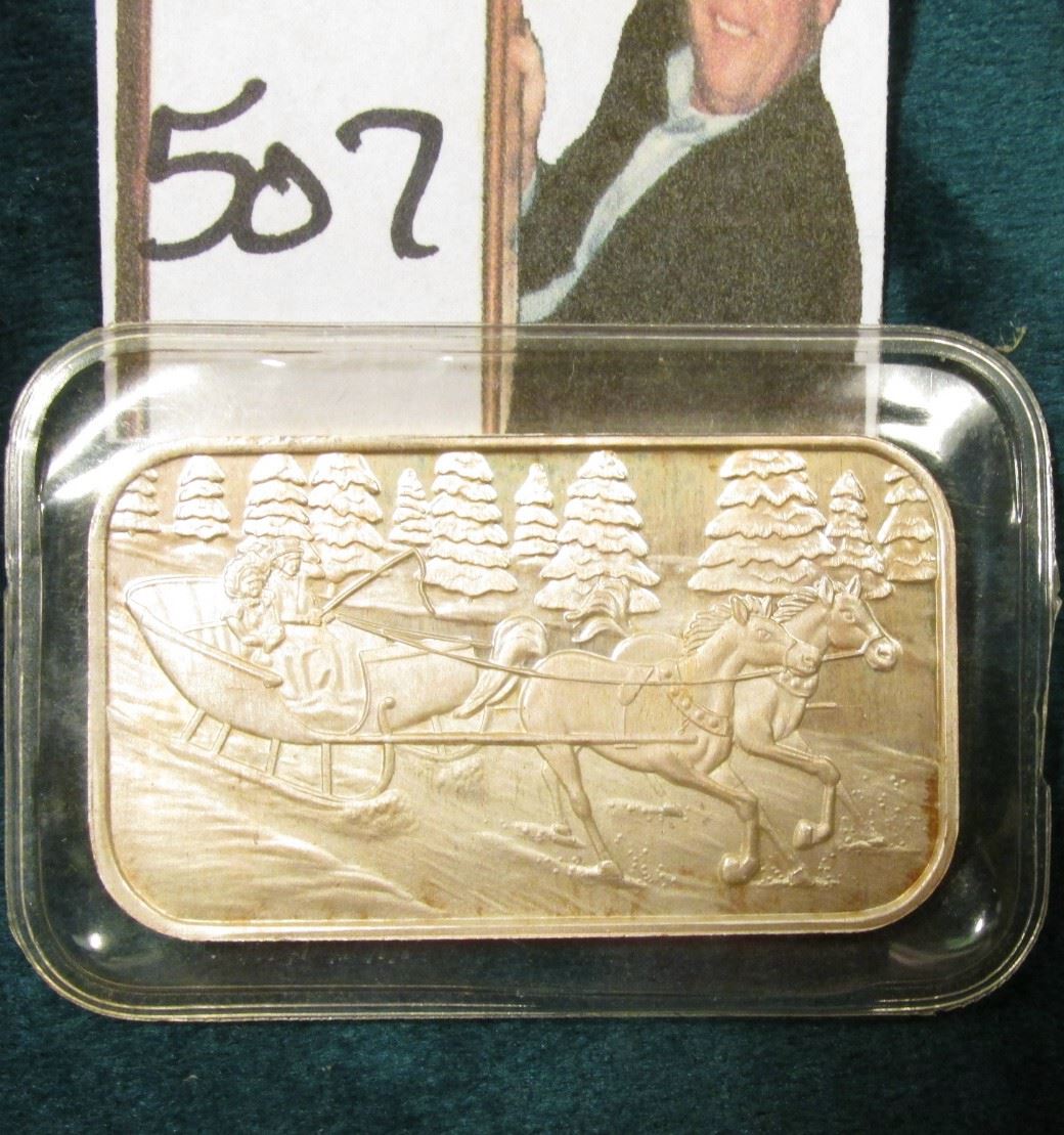 Horse Drawn Sleigh with Riders in this super attractive rectangular .999 Fine Silver One Ounce Bar. Sealed in original plastic from the 1970 era.