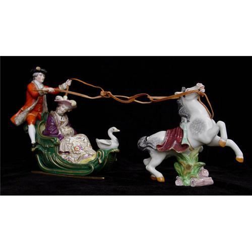Extraordinary winter scene porcelain group of a horse driven sleigh carrying a lady. The sleigh is led by a driver dressed in red livery and sits on bronze skis. Both the sleigh and horse are marked with blue crossed-swords, a mark used by Meissen and other fine porcelain manufacturers. In very good used condition with old restoration. Please ask questions, request additional photos and shipping costs before buying.