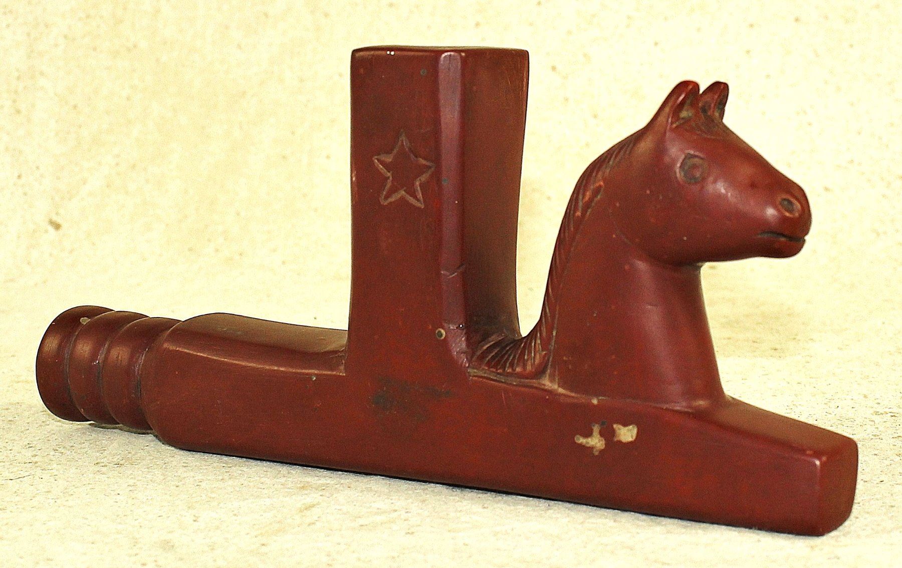 A wonderful large deep red colored figural pipe that exhibits a highly detailed horsehead with compass eyes, and relief ears and mane.