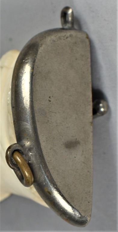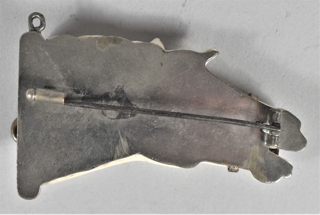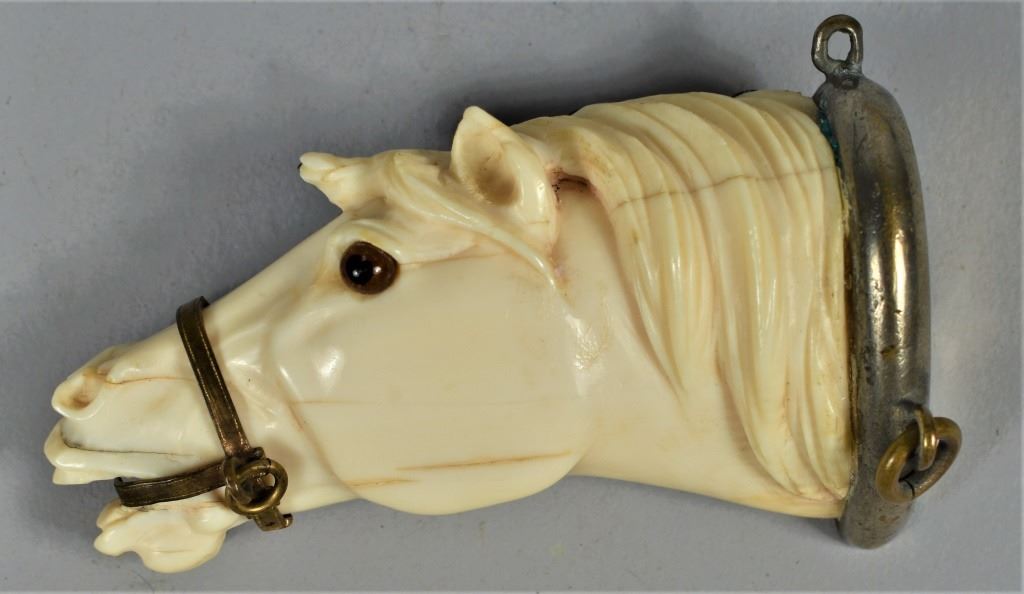 Horse Pin Brooch. Glass eye with gold bit. Nickle plated brass backing and end cap. 2 3/4 X 1 3/4 inches.