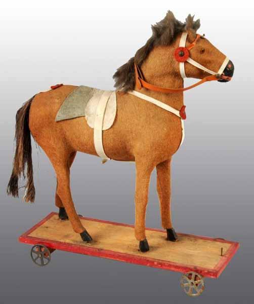 Description Wooden platform with metal wheels. The horse is covered in felt. Part of one rein is missing. Condition (Excellent). Size 12" x 10".