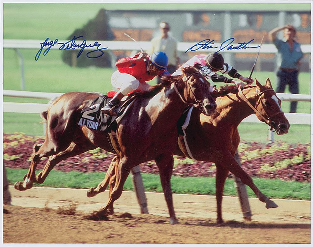 Color satin-finish 14 x 11 photo of of Alydar and Affirmed neck and neck, signed in blue felt tip by Steve Cauthen and Jorge Velasquez. In fine condition.