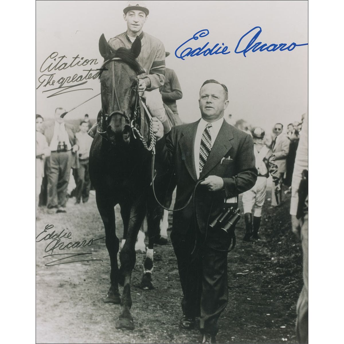 Glossy 8 x 10 photo of Arcaro atop Citation, signed in blue felt tip; the image also bears a facsimile signature. In very fine condition.