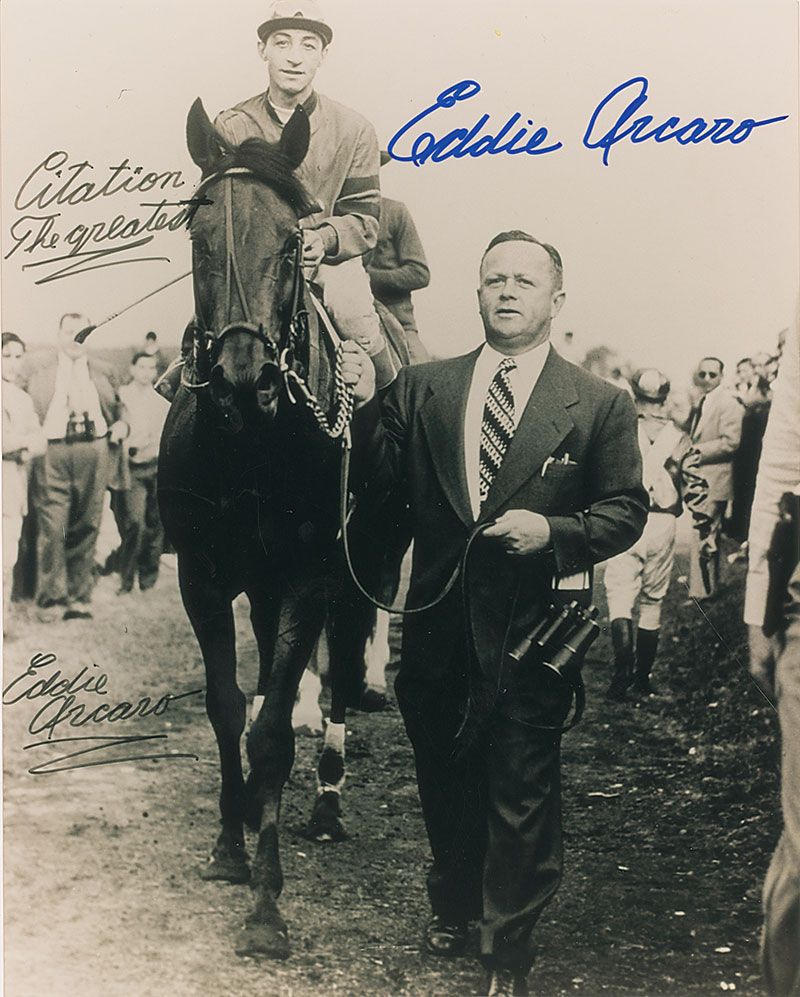 Glossy 8 x 10 photo of Arcaro atop Citation, signed in blue felt tip. In very fine condition, with a previous signature inherent to the original photo.