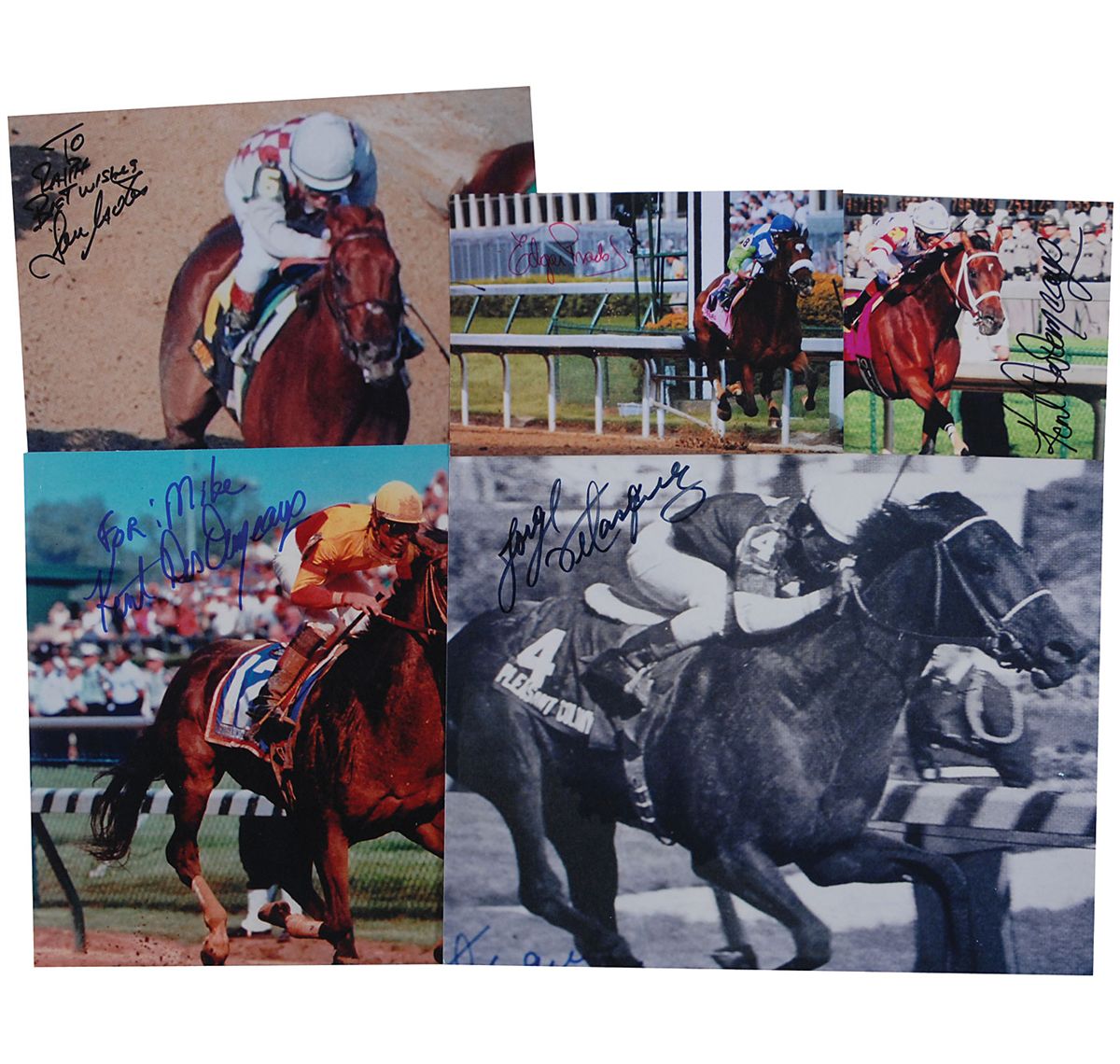 Five signed photos, glossy and satin-finish, ranging in size from 6 x 4 up to 10 x 8, each signed by the winning jockey pictured. Signers are: Edgar Prado, Jorge Velasquez, Jose Santos (ins), and Kent Desormeaux (2, one ins). In fine condition.