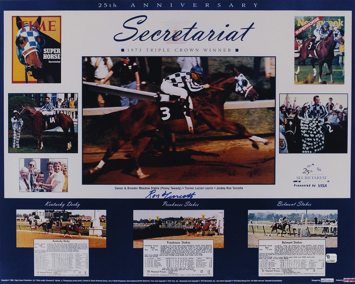 Color glossy 20 x 16 composite photo honoring the 25th anniversary of Secretariat’s Triple Crown, signed in blue felt tip. In fine condition.