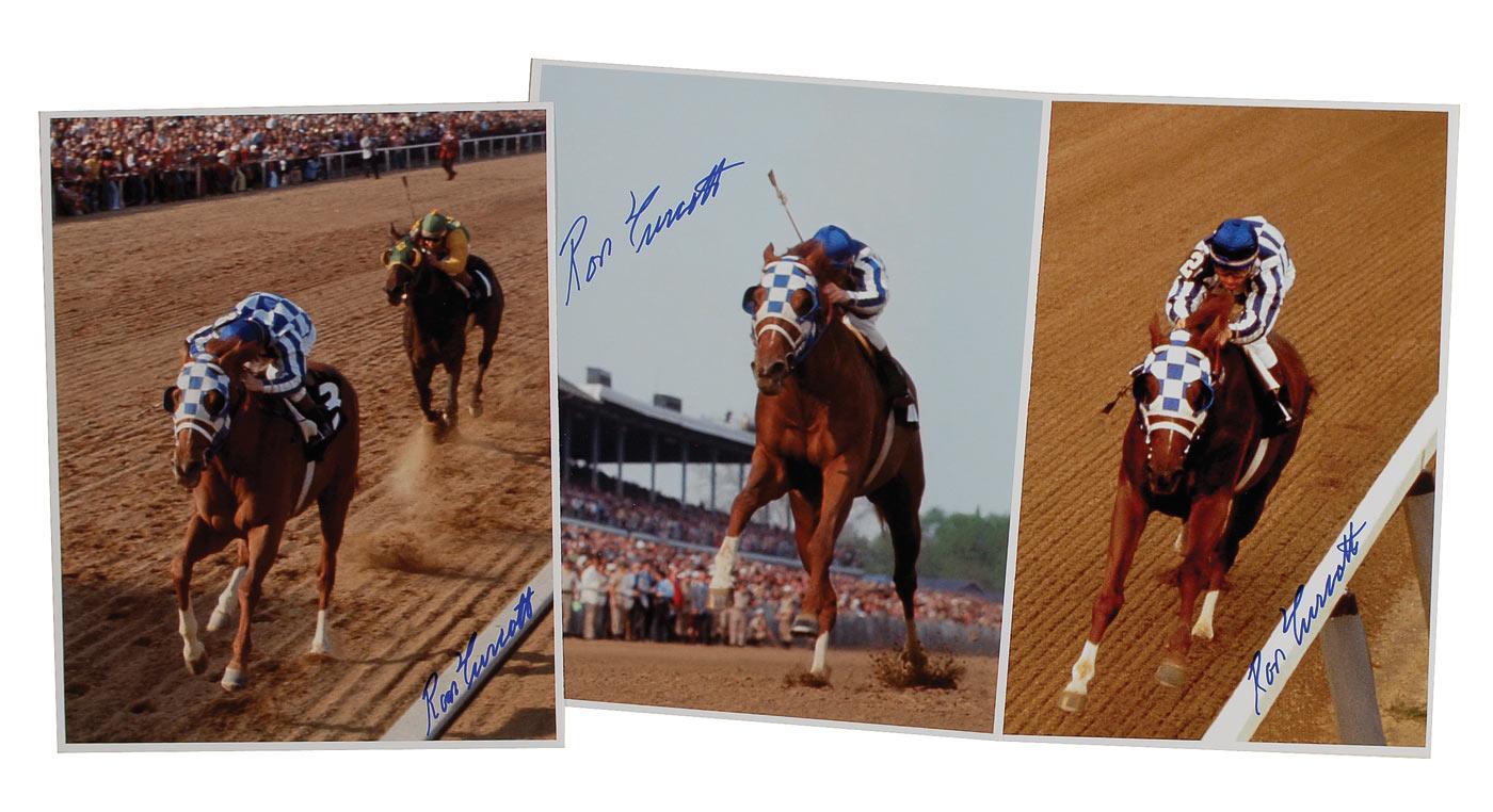 Three color laser print photos of Turcotte atop Secretariat in the Kentucky Derby, Preakness, and Belmont races, each signed in blue felt tip. In fine condition.