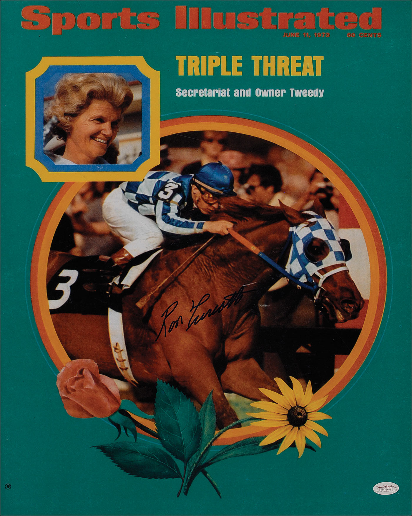 Color satin-finish 16 x 20 photo of the cover of the June 11, 1973, issue of Sports Illustrated, with Turcotte atop Secretariat, signed in blue felt tip. In very fine condition, with a James Spence authentication label affixed to lower corner.