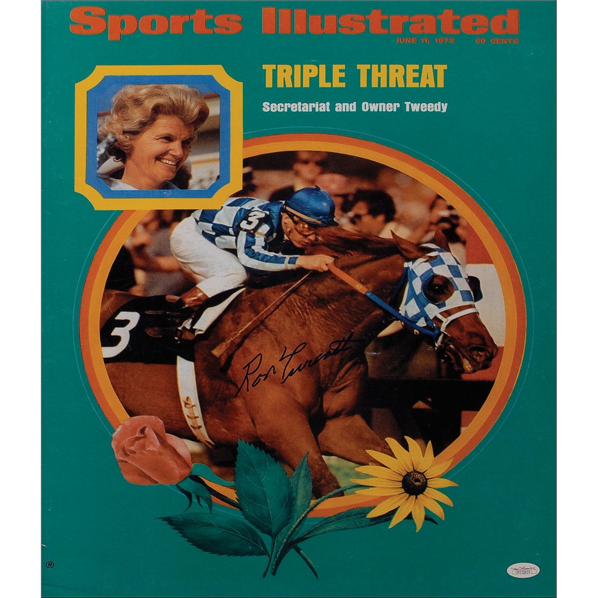 Color satin-finish 16 x 20 photo of the June 11, 1973, cover of Sports Illustrated, signed in blue felt tip. In fine condition, with a few scattered light bends and creases and a couple trivial edge tears. Accompanied by a certificate of authenticity from James Spence.