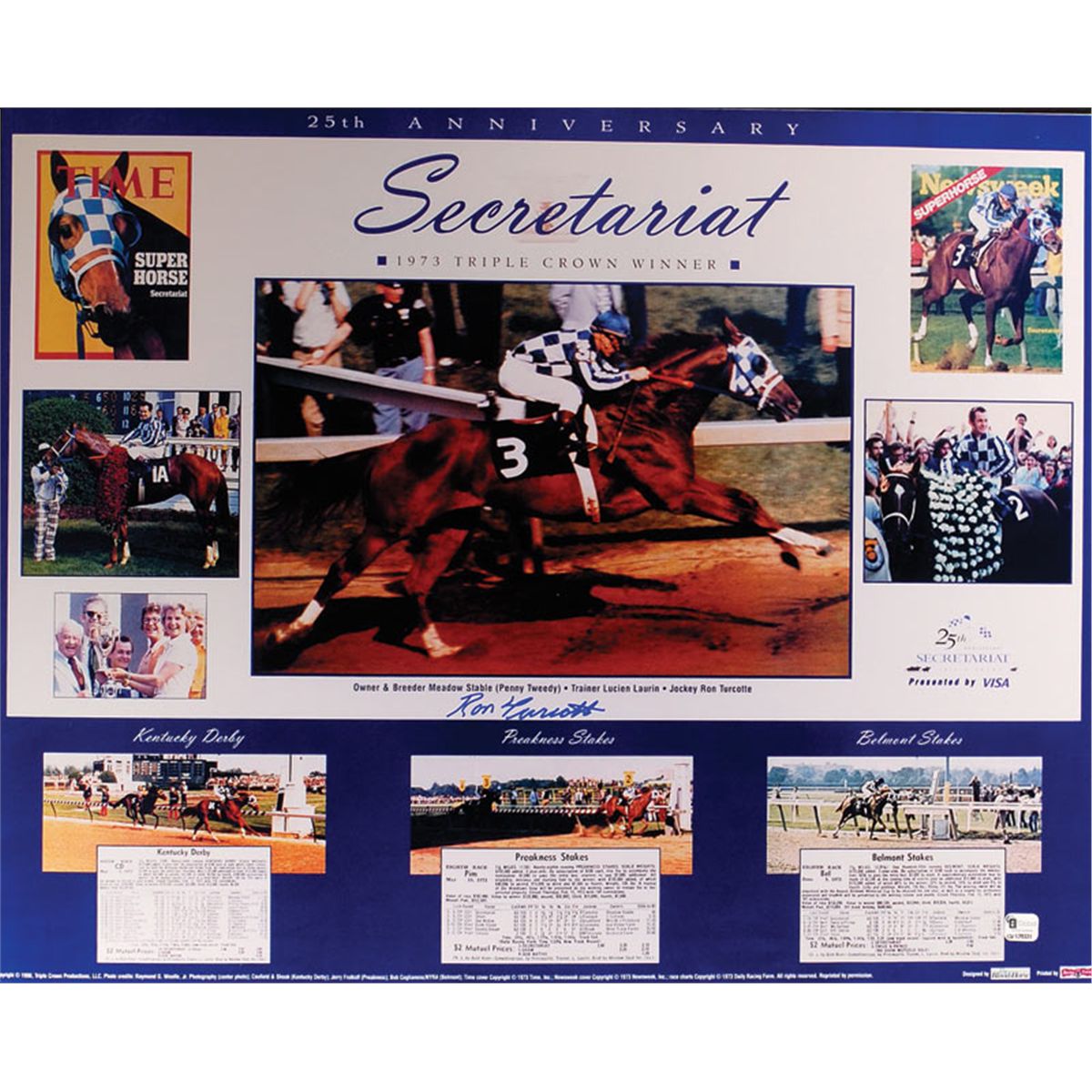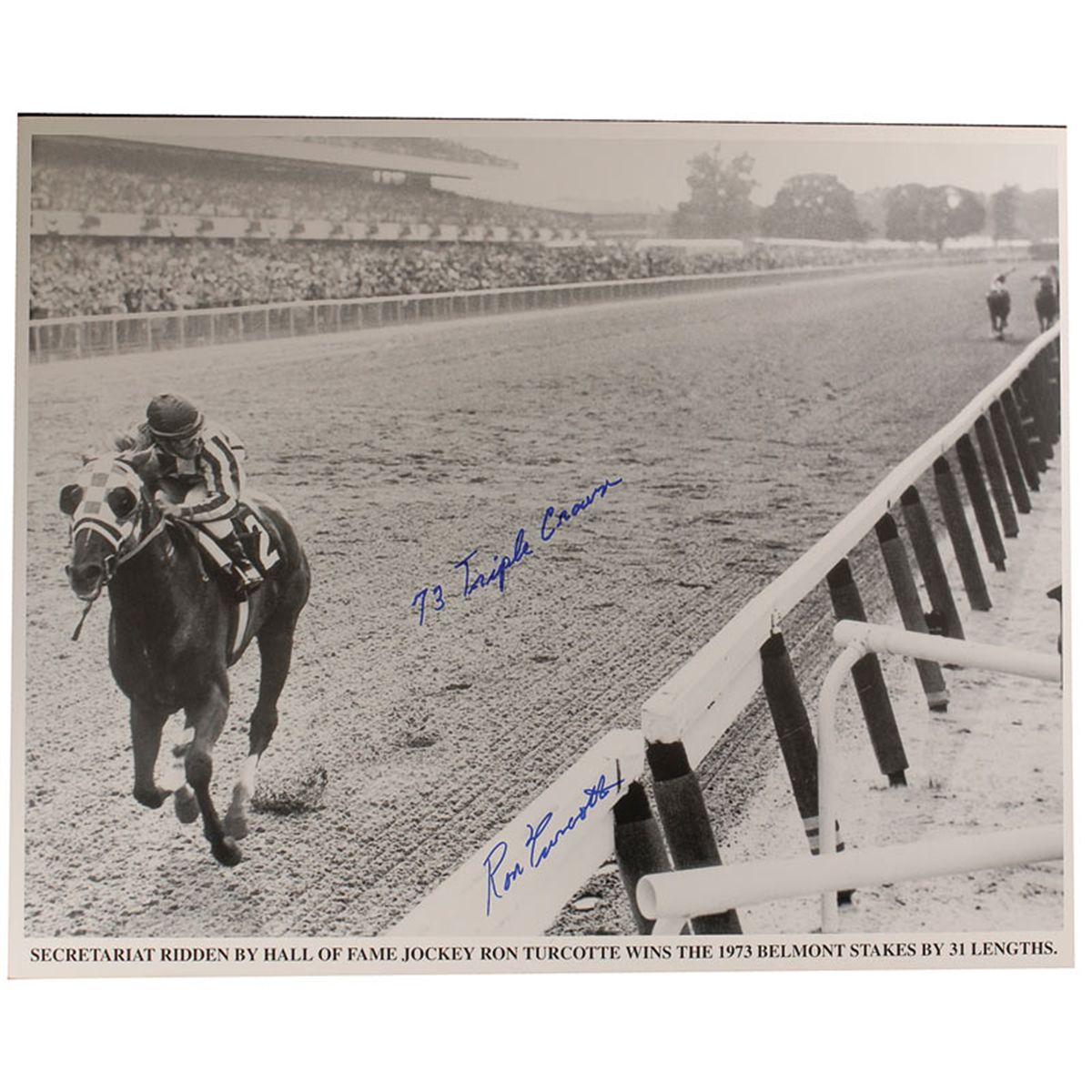 Two 20 x 16 photos: a 25th Anniversary composite photo, featuring images from the Triple Crown victory and signed in blue felt tip; and a cardstock photo of Turcotte winning the 1973 Belmont Stakes by an amazing 31 lengths atop Secretariat, signed in blue felt tip, “73 Triple Crown, Ron Turcotte.” In overall fine condition.