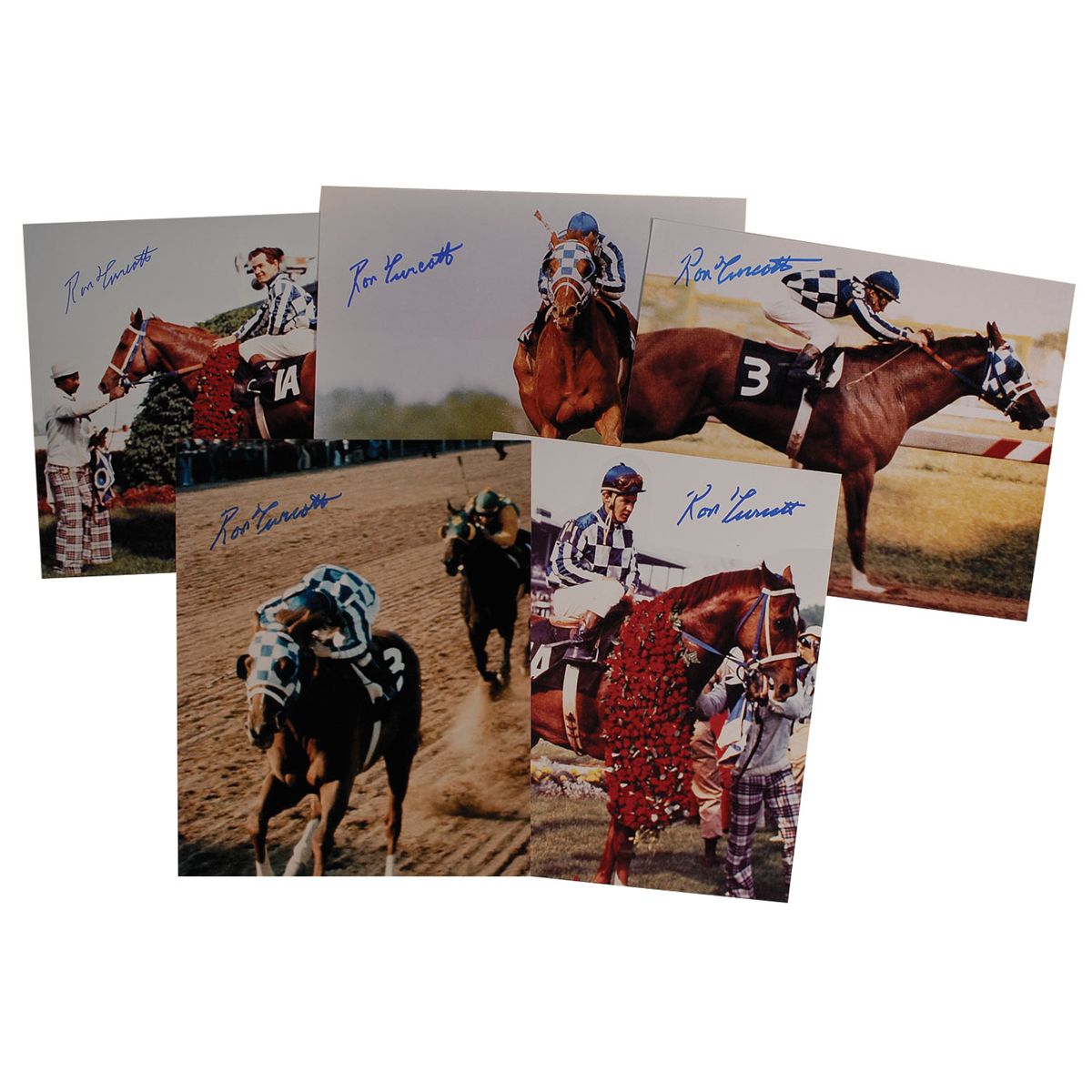 Five color photos, glossy and satin-finish, three 10 x 8 and two 8 x 10, of Turcotte atop Secretariat in the Kentucky Derby, Preakness, and Belmont Stakes, each signed in blue felt tip. In fine condition.