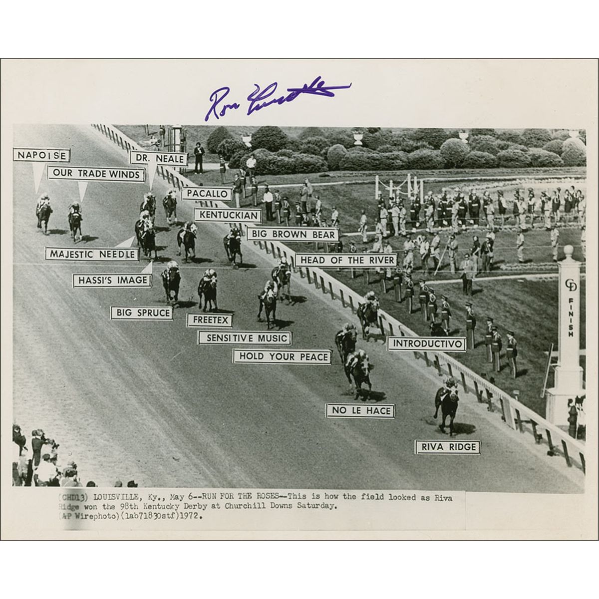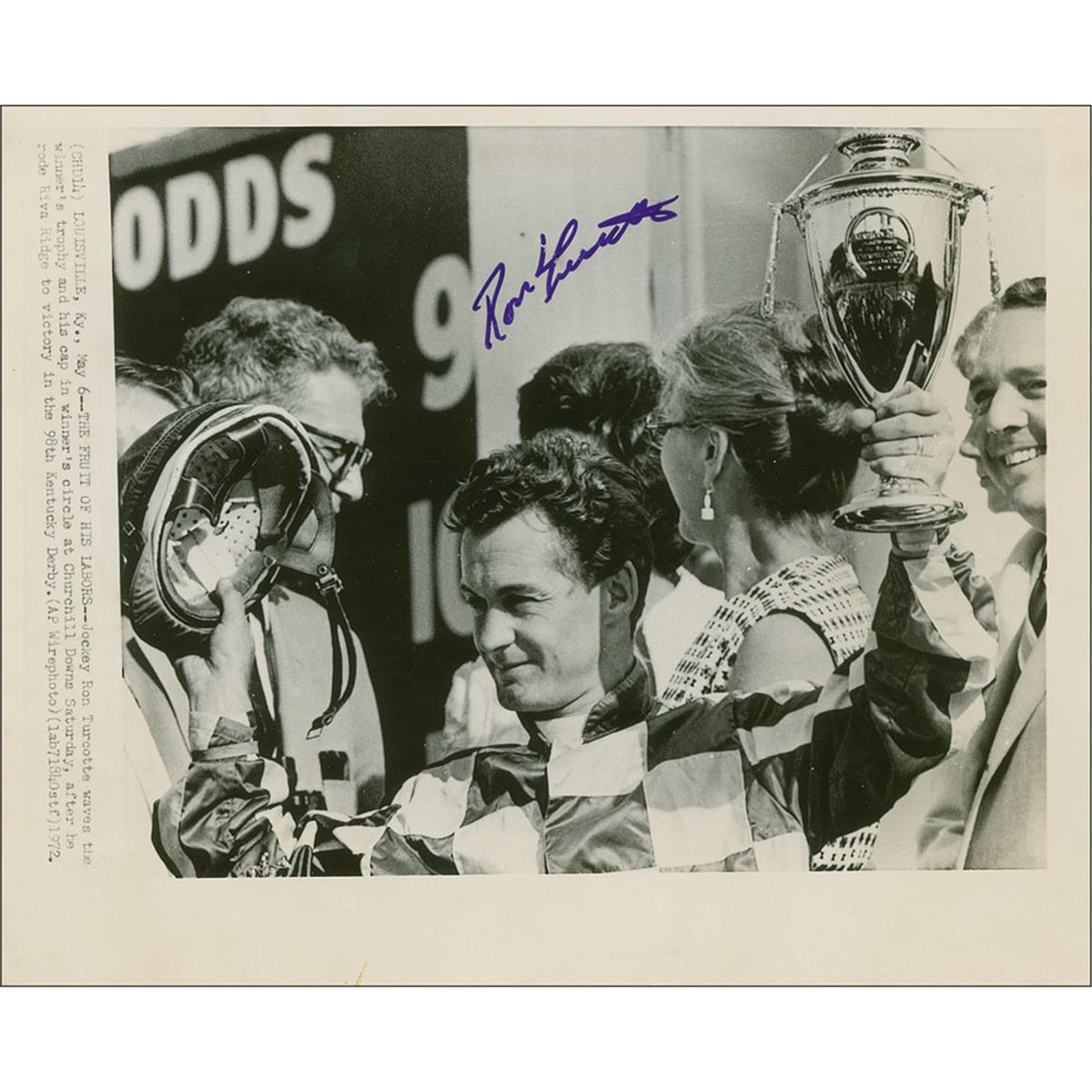 Two different glossy 8 x 10 photos, one action shot of the 98th Kentucky Derby, signed in the top border in purple felt tip, and the other of a victorious Turcotte holding his trophy after winning the derby, signed in purple felt tip. In fine condition, with trivial creasing and toning.