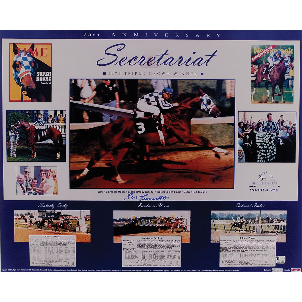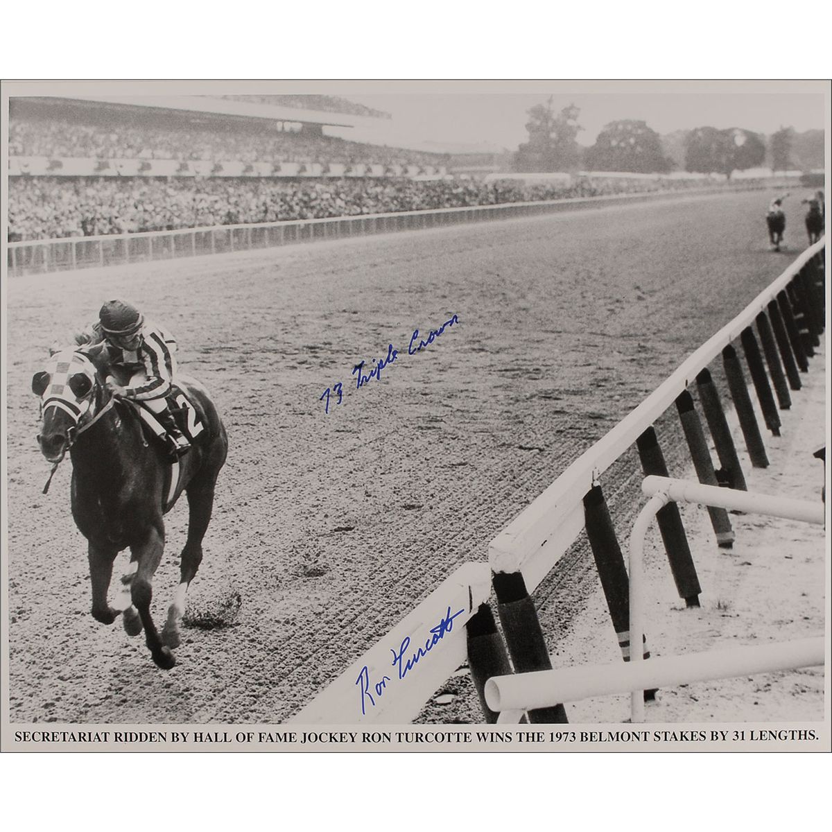 Color glossy 20 x 16 composite photo honoring the 25th anniversary of Secretariat’s Triple Crown, signed in blue felt tip; and a semi-glossy 20 x 16 photo of Turcotte winning the 1973 Belmont Stakes by an amazing 31 lengths atop Secretariat, signed in blue felt tip, “73 Triple Crown, Ron Turcotte.” In fine condition.