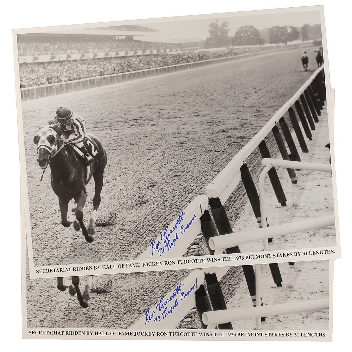 Two identical historic 20 x 16 photos of Turcotte winning the 1973 Belmont Stakes by an amazing 31 lengths atop Secretariat, signed in blue felt tip, “Ron Turcotte, 73 Triple Crown.” Rolled and in fine condition.