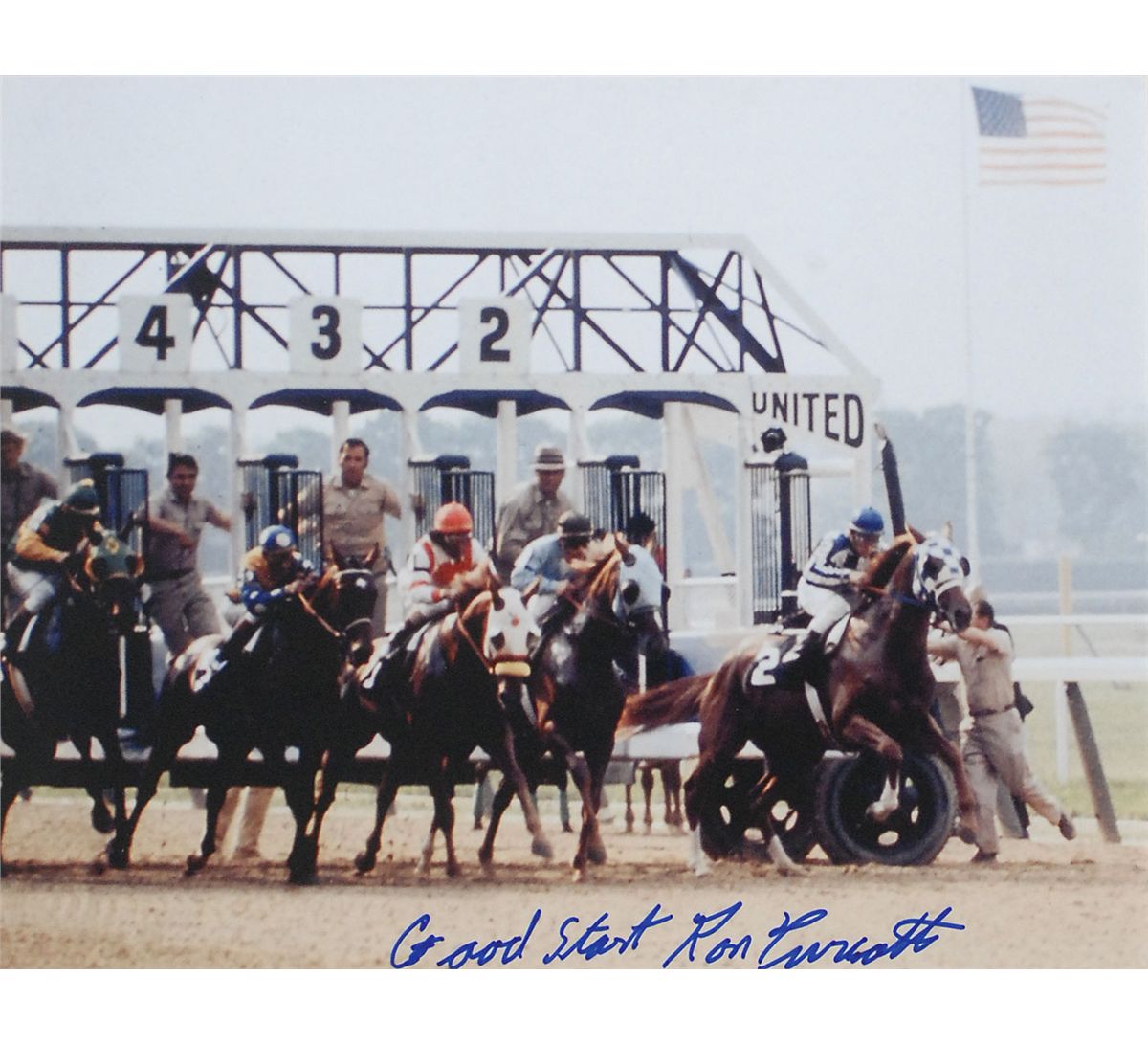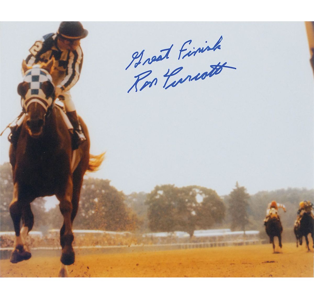 Two color glossy 9.25 x 7.25 photos of Turcotte atop Secretariat in the Belmont, each signed in blue felt tip, with Turcotte adding “Good Start” to one and “Great finish,” to the other. Double-matted with a commemorative plaque to an overall size of 14 x 24. In fine condition.