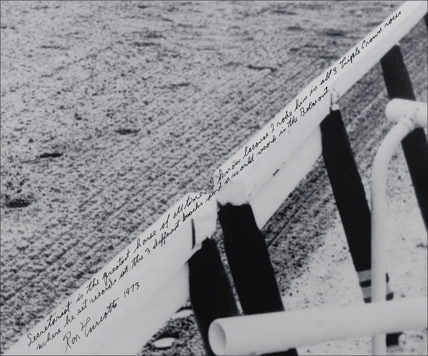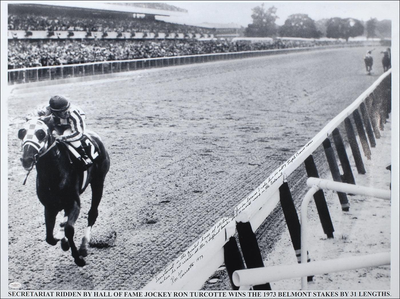 Exceptional 32 x 24 photo of Turcotte winning the 1973 Belmont Stakes by an amazing 31 lengths atop Secretariat, signed in black felt tip, “Secretariat is the greatest horse of all time. I know because I rode him in all 3 Triple Crown races where he set records at the 3 different tracks and a world record in the Belmont. Ron Turcotte 1973.” Accompanied by a certificate of authenticity from James Spence. Rolled and in fine condition. Pre-certified Steve Grad/PSA/DNA and RRAuction COA.