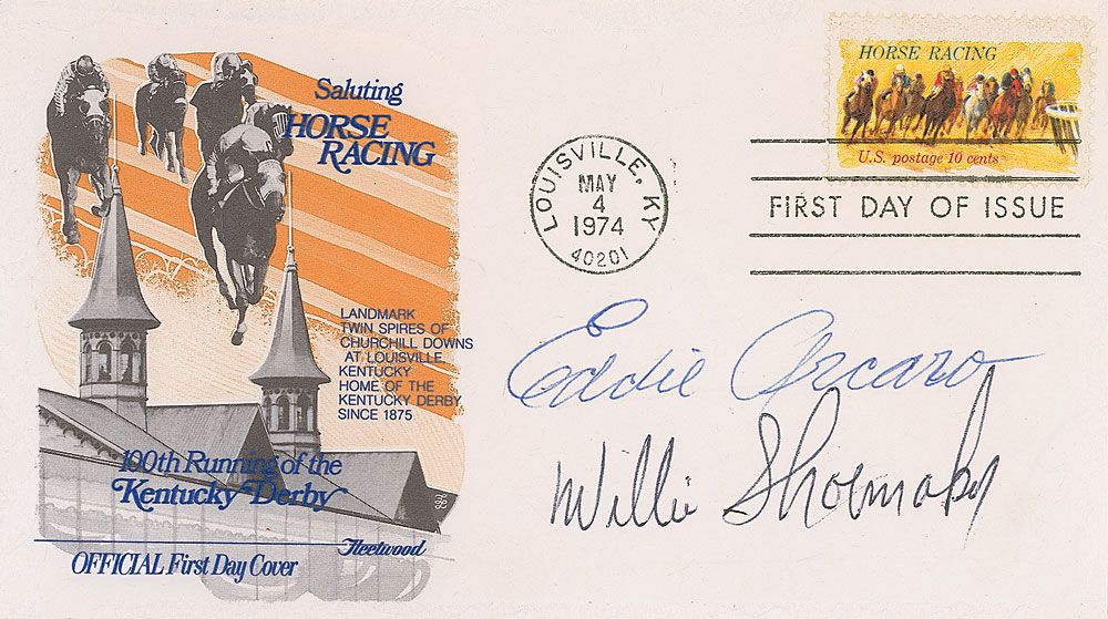 Commemorative cover with a cachet honoring the 100th running of the Kentucky Derby, signed in black ballpoint by Willie Shoemaker and in blue ballpoint by Eddie Arcaro. In fine condition, with small mounting remnants to reverse.
