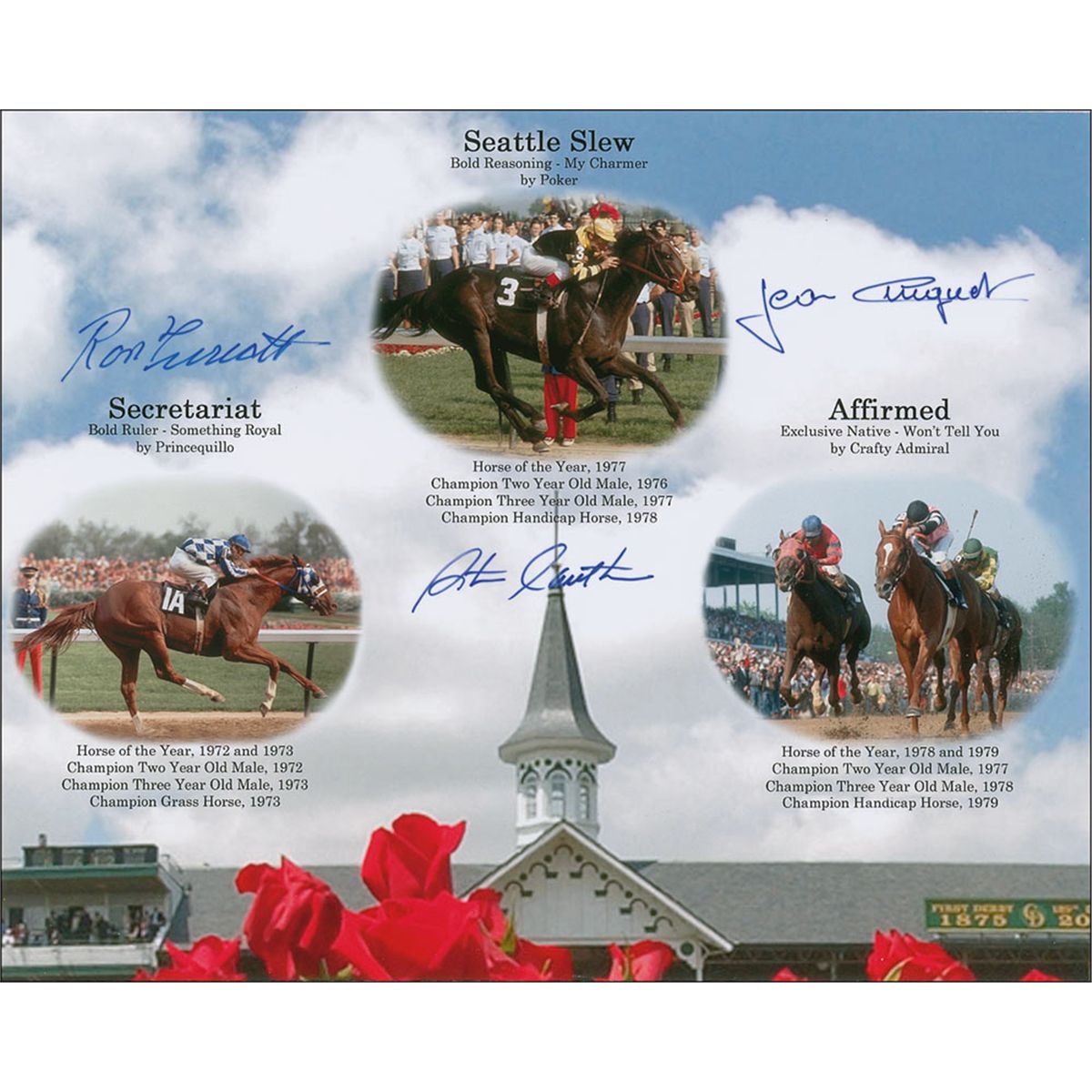 Color satin-finish 10 x 8 composite photo of the three Triple Crown winners atop their horses, signed in blue felt tip by Jean Cruguet, Ron Turcotte, and Steve Cauthen. In very fine condition.