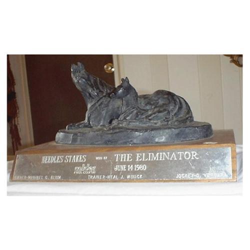 A rare find in horse racing trophies. The original plaque is on the trophy. <p Engraved: Needles Stake. Calder Race Course. June 14, 1980. <p>Won by The Elimantor. Owner - Maribel G. Blum. Trainer - Neal J. Winick. Jockey - O. Vergara.<p>A beautiful black mare caring for her foal laying down in the grass (made of resin), mounted on a wood base.<p>Measures 12 inches long by 8 inches deep and 7 inches tall.<p>A great gift of the horse enthusiast or racing fan.