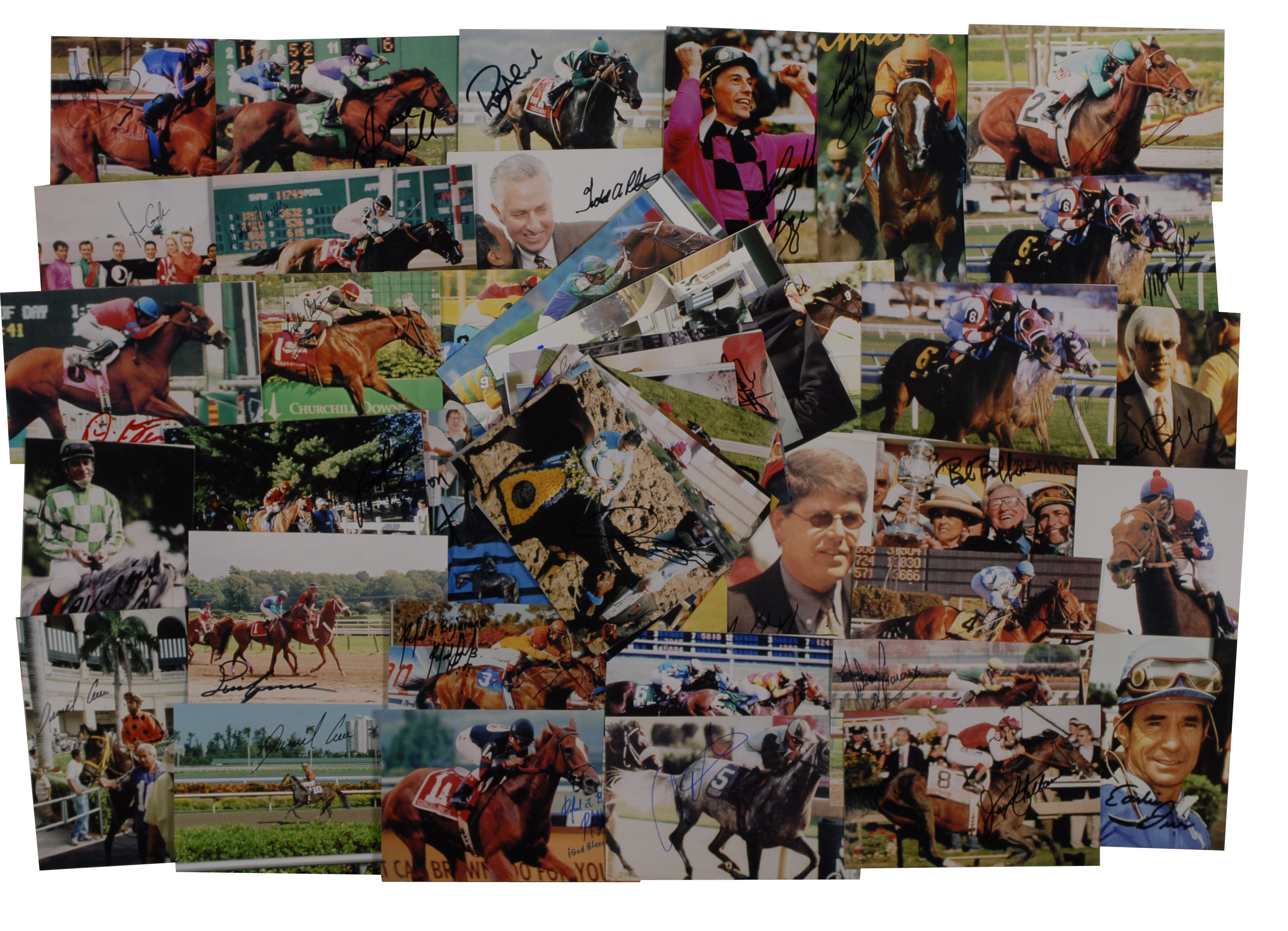 Collection of 50 signed photos, ranging in size from 6 x 4 up to 7 x 6.5, various finishes, each signed in ink or felt tip by the respective jockey or trainer pictured. Signers are: Robby Albarado, Bob Baffert (2), Russell Baze (3), Tyler Baze, Rafael Bejarano (2), Shaun Bridgmoham, Jesse Campbell, Javier Castellano (3), Eddie Castro, Jorge Chavez, Daniel Coa (2), Jon Court, Jose Espinoza, Earlie Fires (2), Todd Fletcher, David Flores, Ryan Fogelsonger, Garrett Gomez (2), Aaron Gryder, Mark Hennig, Mark Johnson, Corey Lanerie, Julien LeParoux, Jose Lezcano, Richard Mandella, Eddie Martin, Jr., Willie Martinez (2), Corey Nakatani (2), Mario Pino (2), Gabriel Saez, Jose Santos, Robyn Smith-Astaire (2), Mike Smith (2), Alex Solis, Cornelio Velasquez, and Cornellio Velasquez. In fine condition.