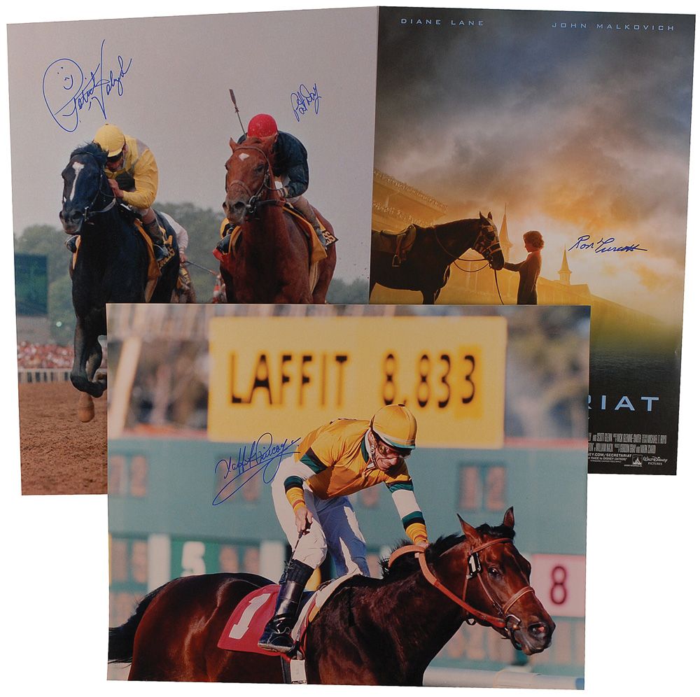 Three signed photos: one color satin-finish 16 x 20 photo of Pat Valenzuela and Pat Day neck-and-neck, signed by both in blue felt tip; one color satin-finish 20 x 16 photo of Laffit Pincay, signed in blue felt tip; and one color 13 x 19 movie poster for Disney’s Secretariat, signed in blue felt tip by Ron Turcotte. In overall fine condition, with scattered surface creases.