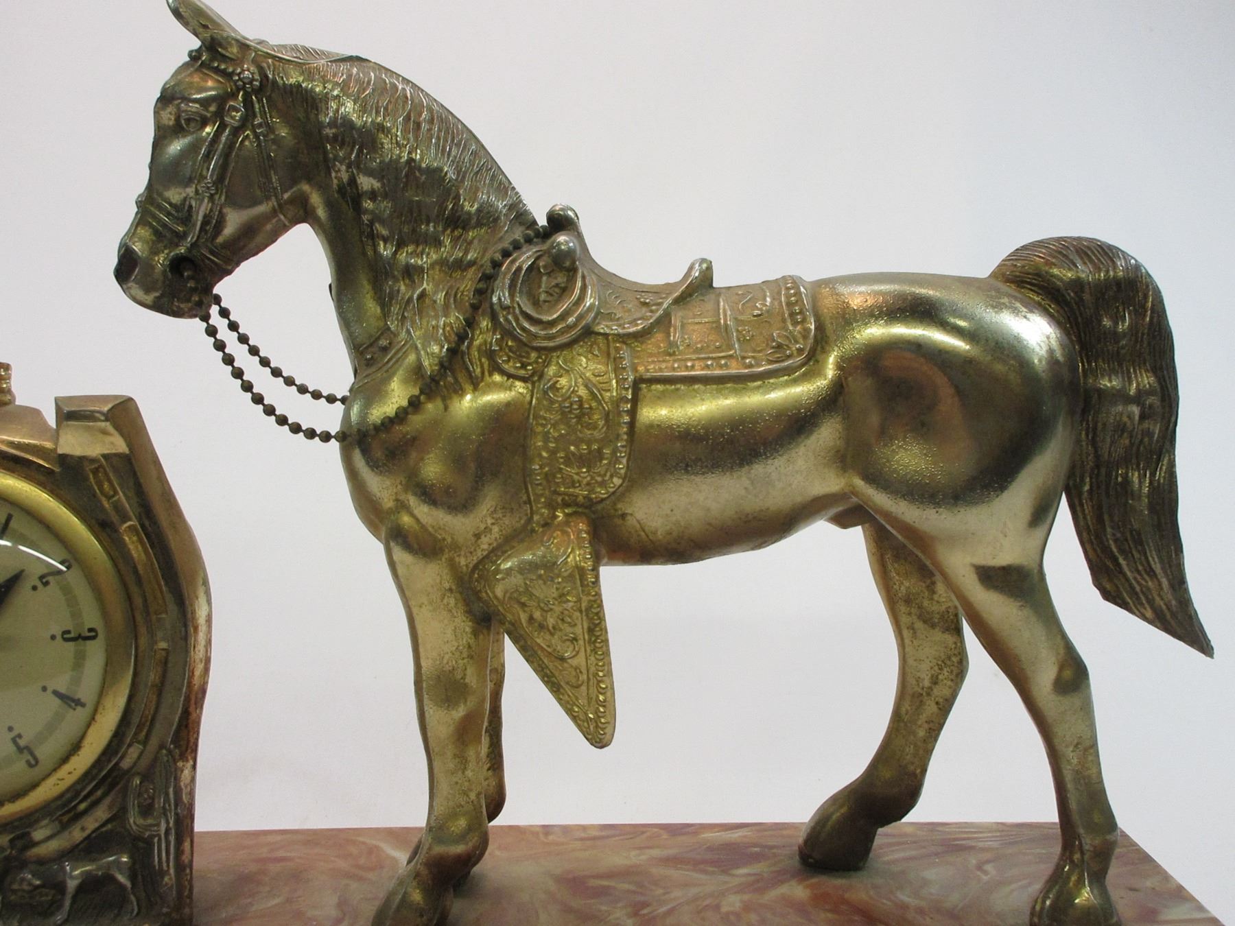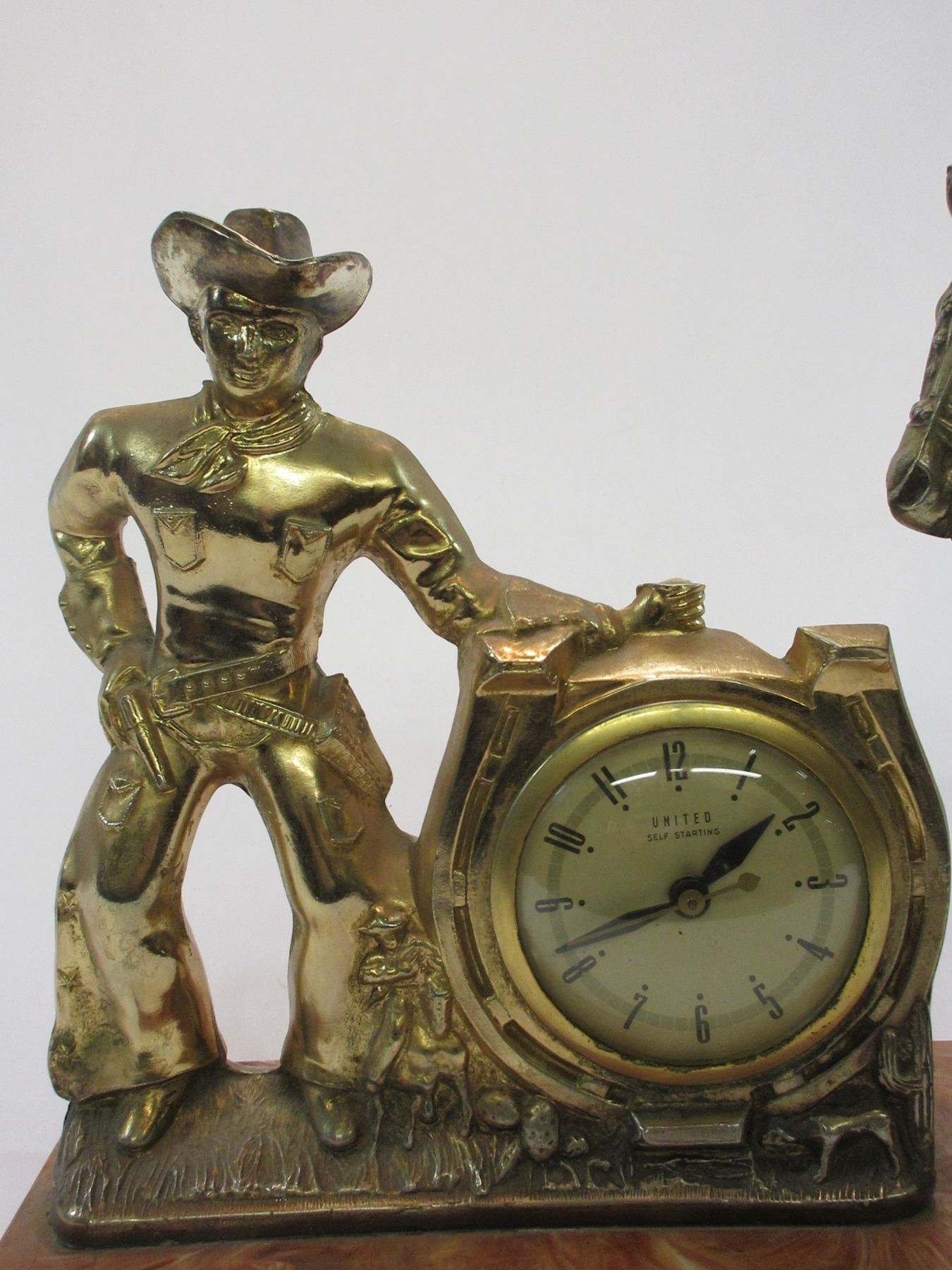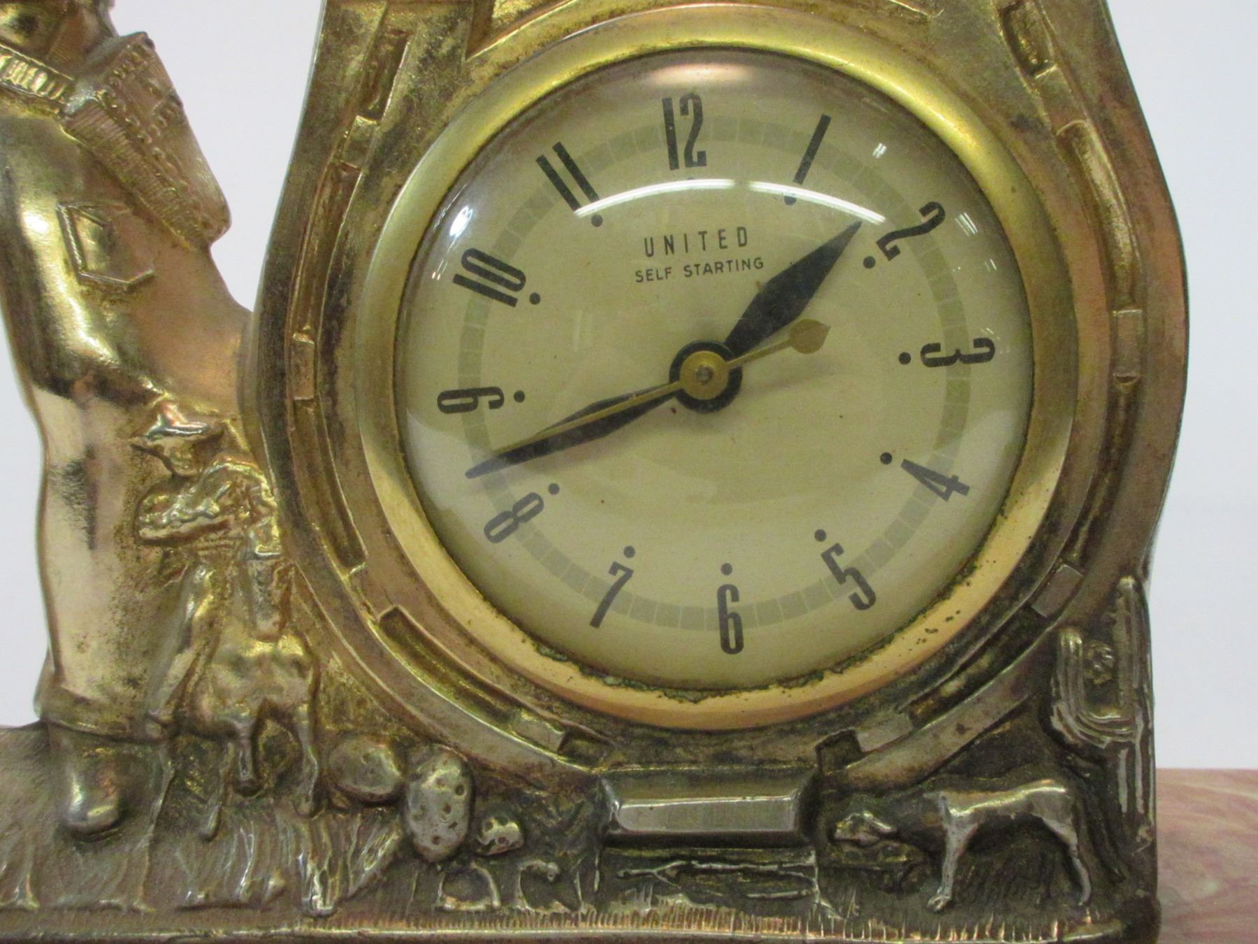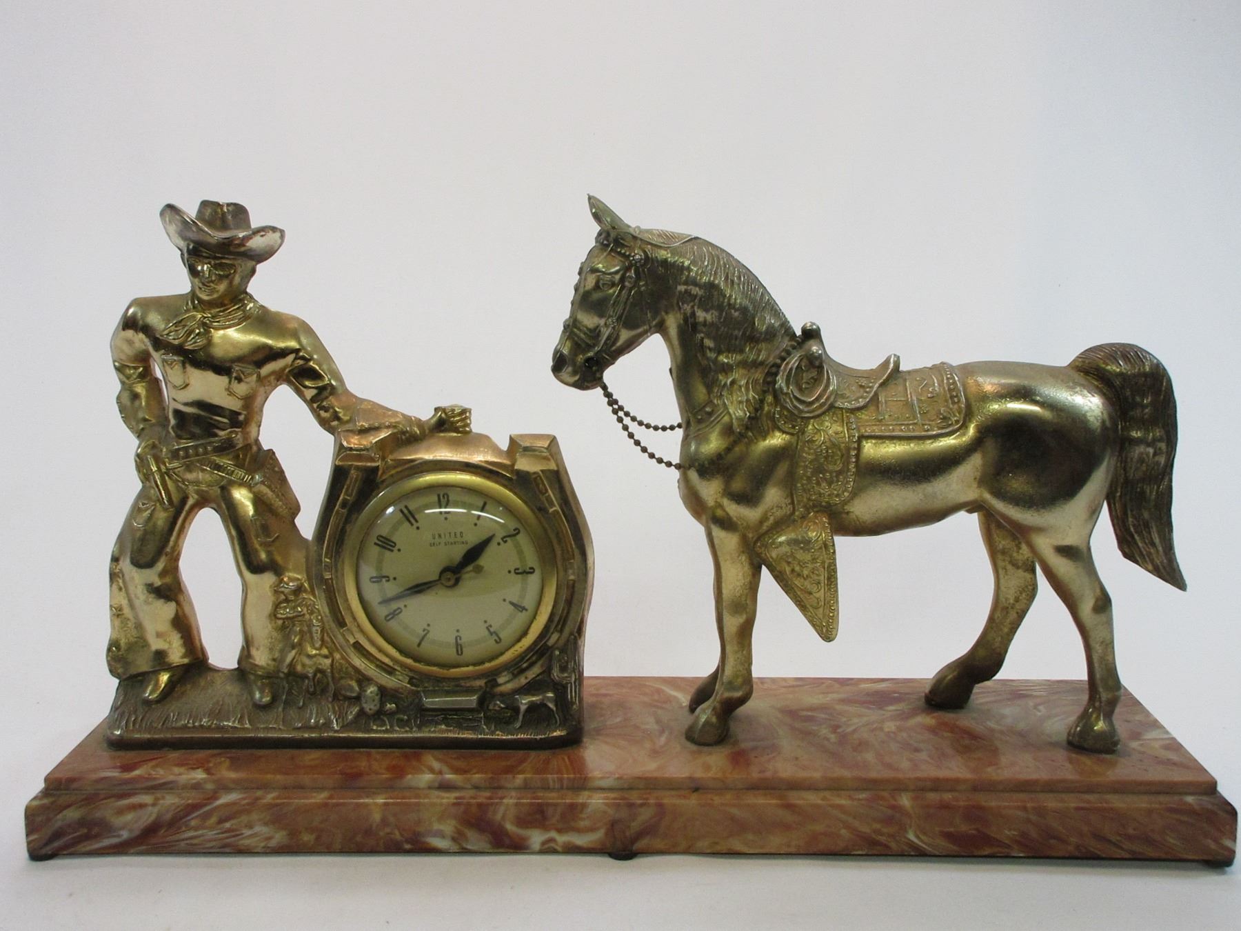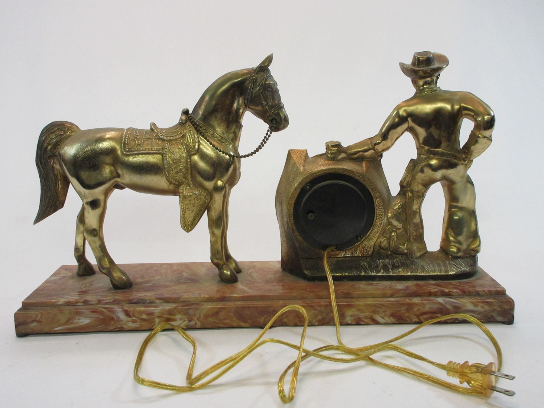 Horse and Cowboy Clock- Clock Works and is Marked United Self Starting- Plastic Base 20.5"L X 5"D X 11.5"H