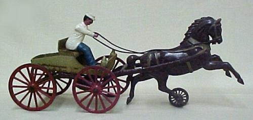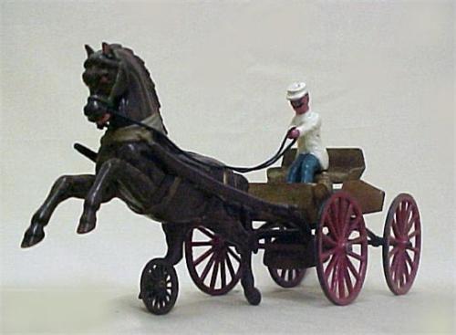 Horse drawn buggy with driver; cast iron; working condition; 15" across; some paint loss and rust.