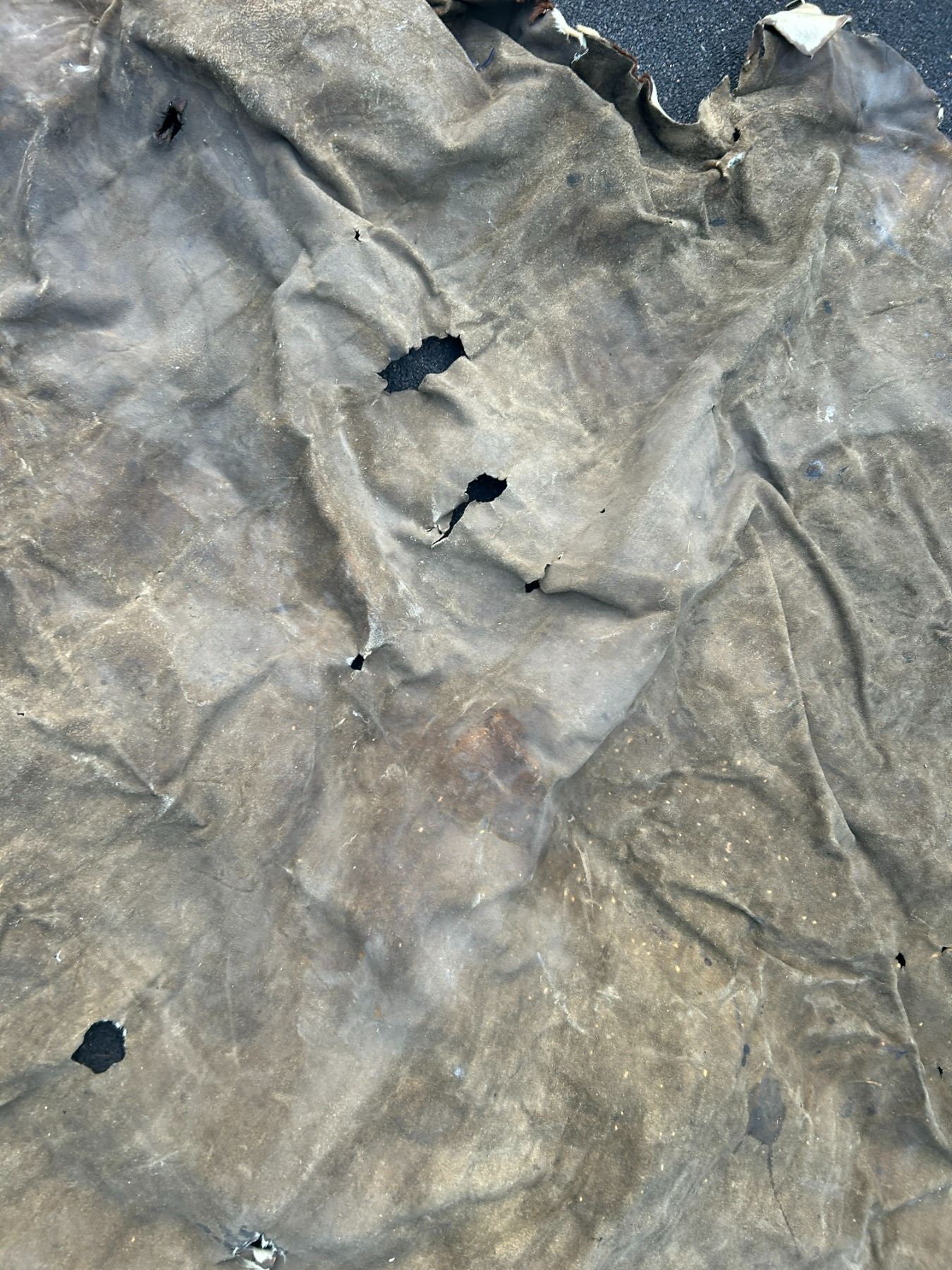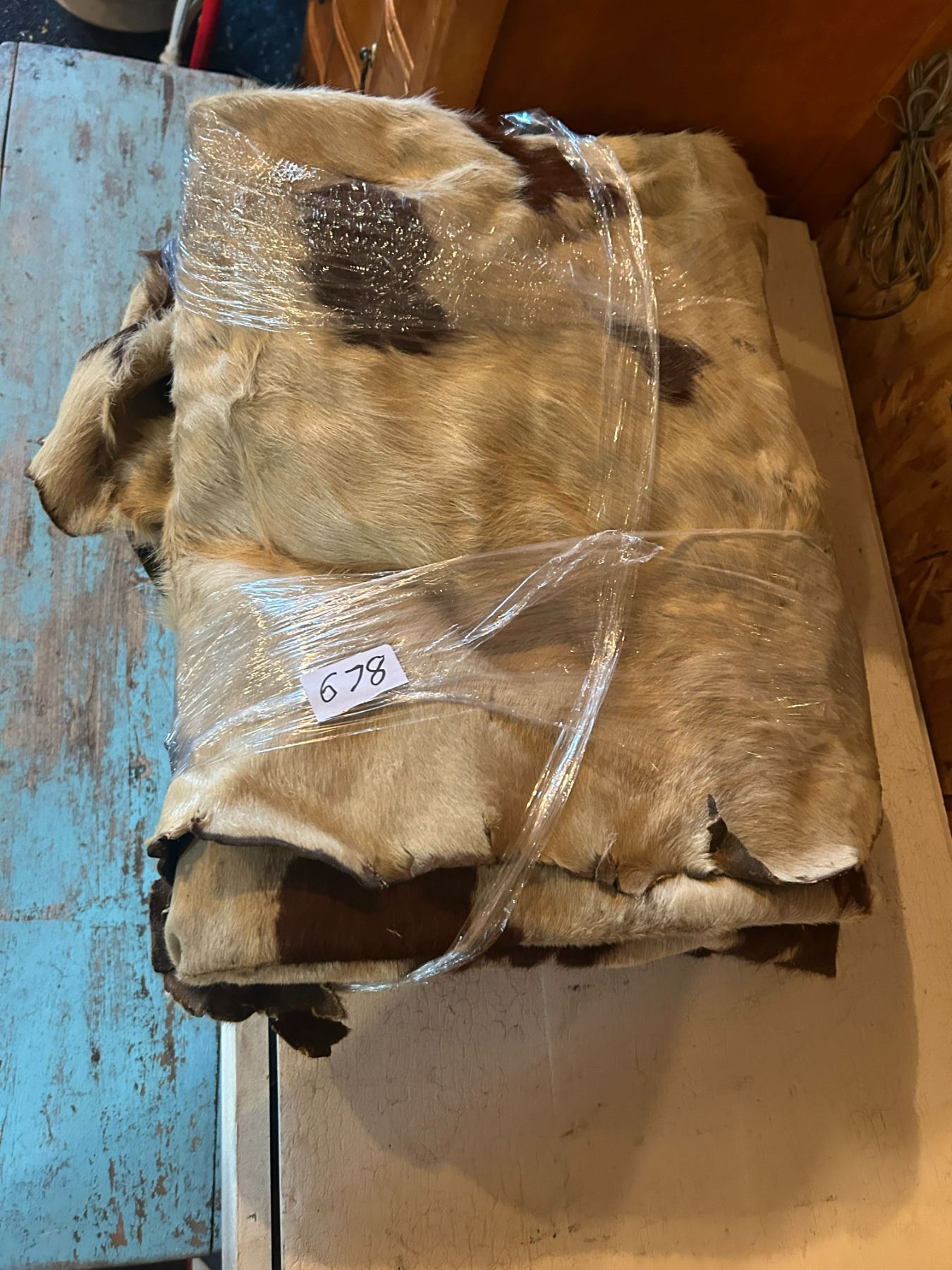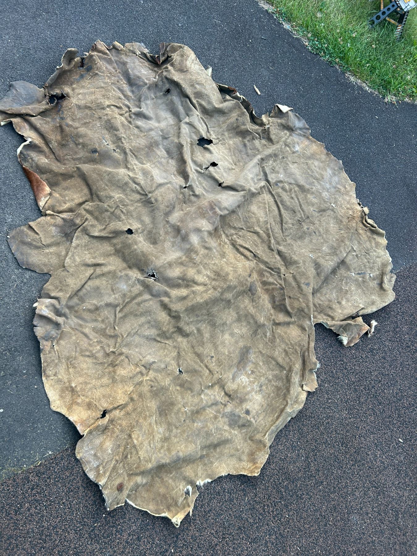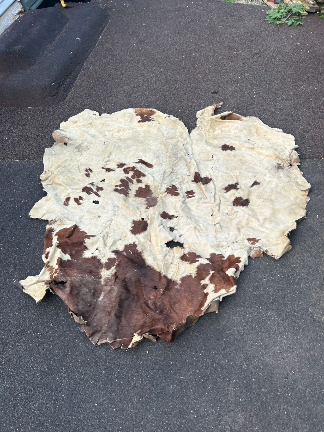 Horse hide blanket 70"x66" at widest points-tanned back- paint- damaged in spots