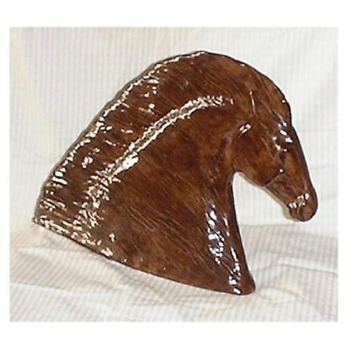 Horsehead ceramic statue. Hand-made by artist, Ruth Petracca.This is a prototype piece only 3 exist.<p>Rich Color glazes are from a light to dark brown in shading in this Hand fired piece.<p>Measurements are: 11" tall, 16" long, and 3 1/2" wide.<p>In excellent condition.<p>This is a very elegant piece. Beautiful detailed head, long flowing mane.<p>A peice of equine art you would be very proud to display in any home, or business office. A great gift for the horse lover.