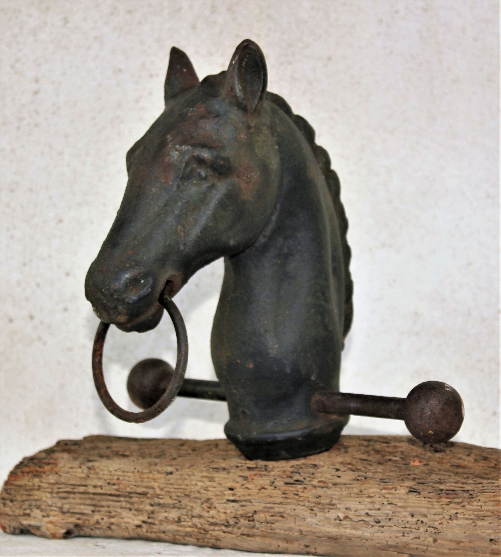 Nice antique iron figural horse head hitching post with seldom seen tie bars and ring.