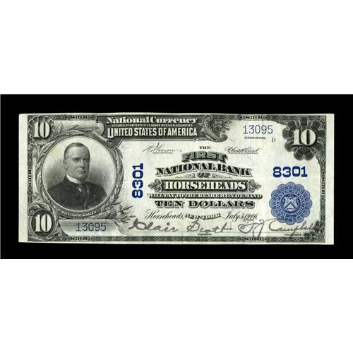 <B>Horseheads, NY</B></I> - $10 1902 Plain Back Fr. 626 <B>The First NB</B></I> Ch. # 8301<BR>While small notes from this uniquely titled Chemung County community do turn up, large examples are another story entirely, with the census showing just five such notes, most low grade. This piece, which is new to that listing, is a pleasant exception. Like most notes from this collection, it has that old time quality that is so seldom evident on notes available in today's market. Bright <B>Very Fine+,</B></I> certain to see plenty of bidding before the hammer falls.<BR><BR><b>Shipping:</b> Coin/Currency (<a target="_blank" href="http://www.heritageauctions.com/common/shipping.php">view shipping information</a>)