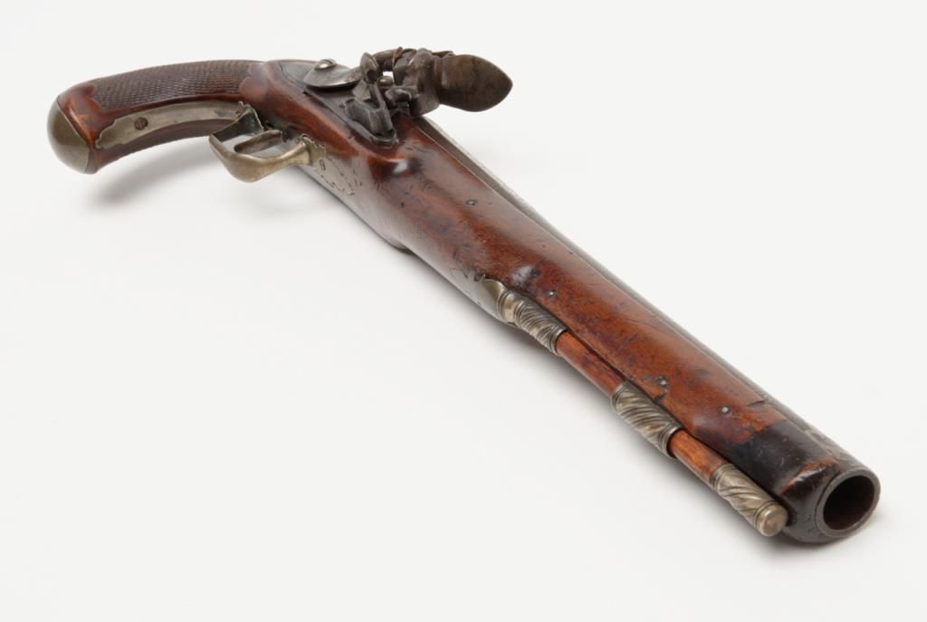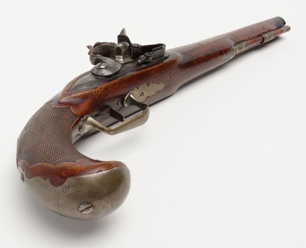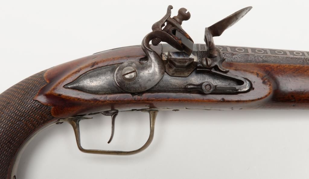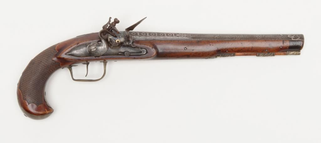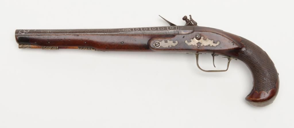 Horseman’s size Germanic flintlock pistol with silver mounts and elaborate etched Damascus pattern and silver inlaid Turkish style barrel with fancy gold cartouche in Arabic designs or letters. This pistol measures 17 ½” overall with11 ¼” barrel in .60 caliber smoothbore. The metal surfaces show a gray to brown patina finish with some minor rust and erosion. The pistol is in its original flintlock configuration with proper hammer and parts. The breech shows traces oforiginal case hardening and there is a gold touch hole plug. The pistol shows plain silver mountings with turned ferrules and matching tip to the ramrod. This very large pistol is equipped with a key socket for attachment of shoulder stock whichis not present. Although not signed the style and age of the pistol is reminiscent of arms made by the Kuchenreuter family. Wood stock included. Est.: $1750-$3500