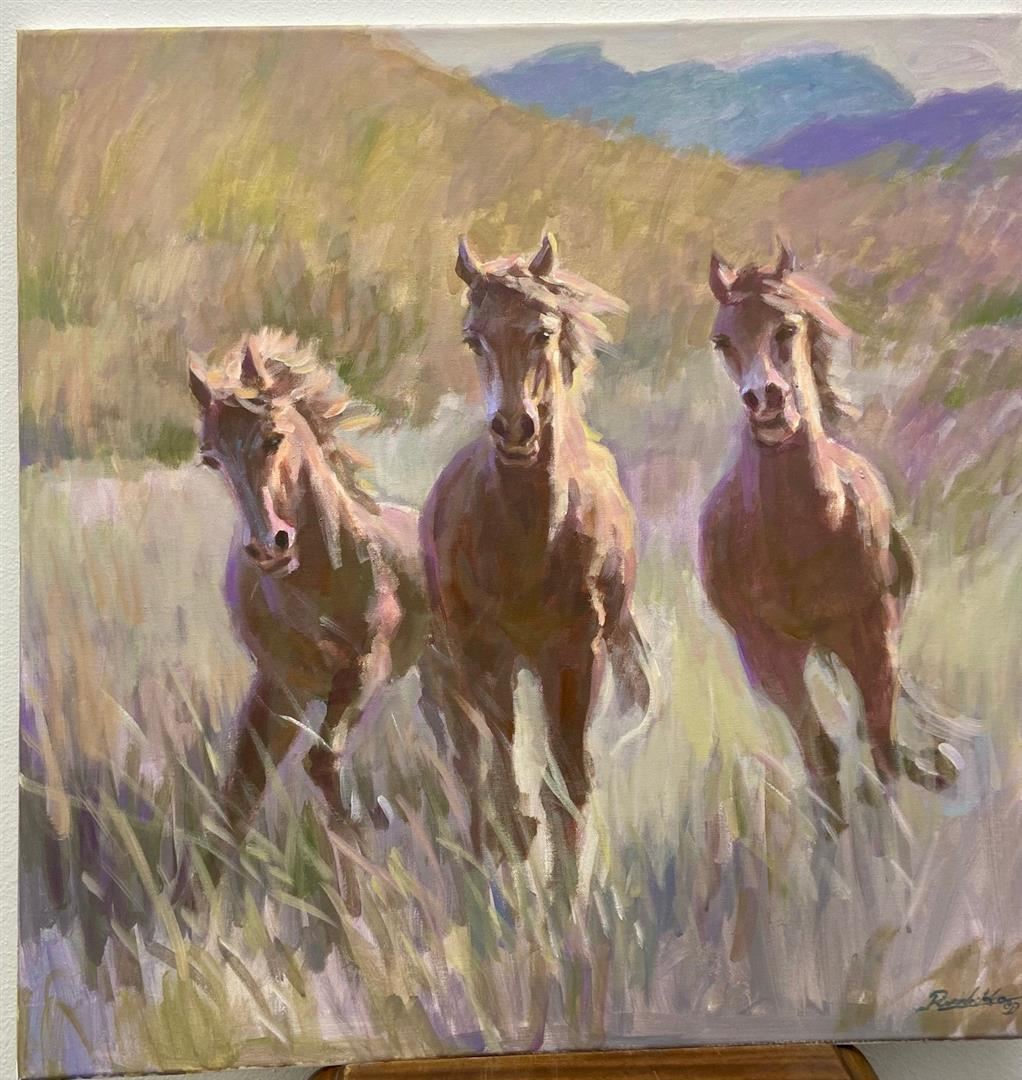 A 30x30" original acrylic on canvas by Richard Ho brings us upfront and close with a powerful trio of wild horses.