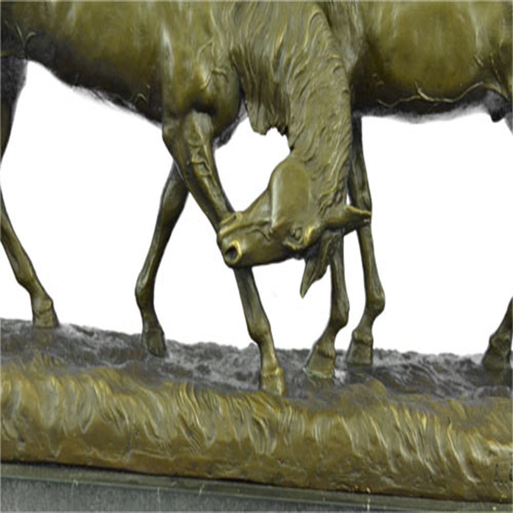 The horse was highly popularized in the art of the Romans with numerous popular pieces depicting the anatomical features of the horse to more dynamic sculptures of battles and chariot races. The horse gained further recognition by the cowboys and American Indians of the Wild West who relied so heavily on this creature for survival. This is a beautiful Bronze Sculpture cast using the Lost Wax Method and has a brown patina and mounted on a marble base. Bronze Dimensions with Marble Base: Height 14 X Width 21 inches. Weight: 30 LBS.